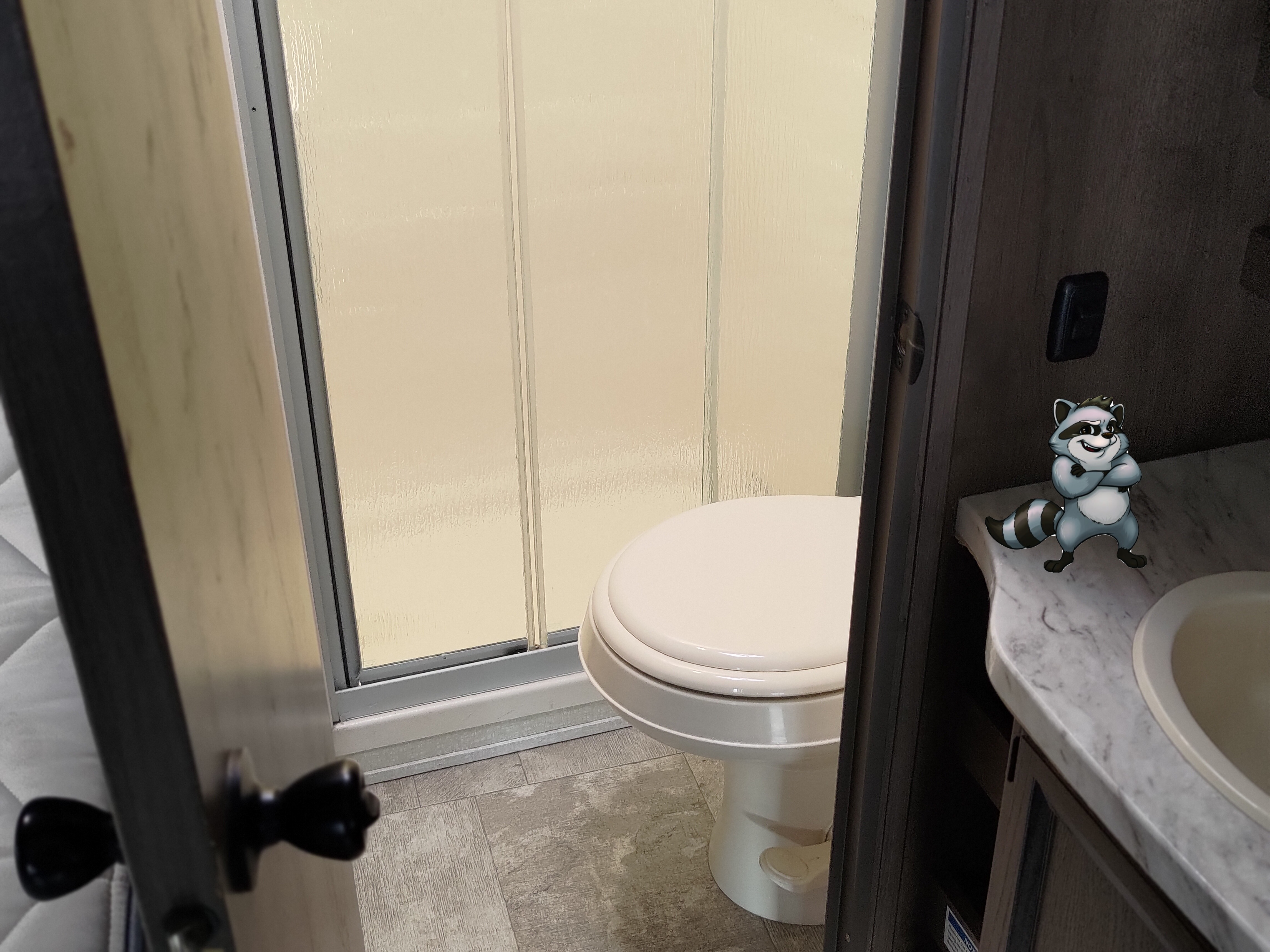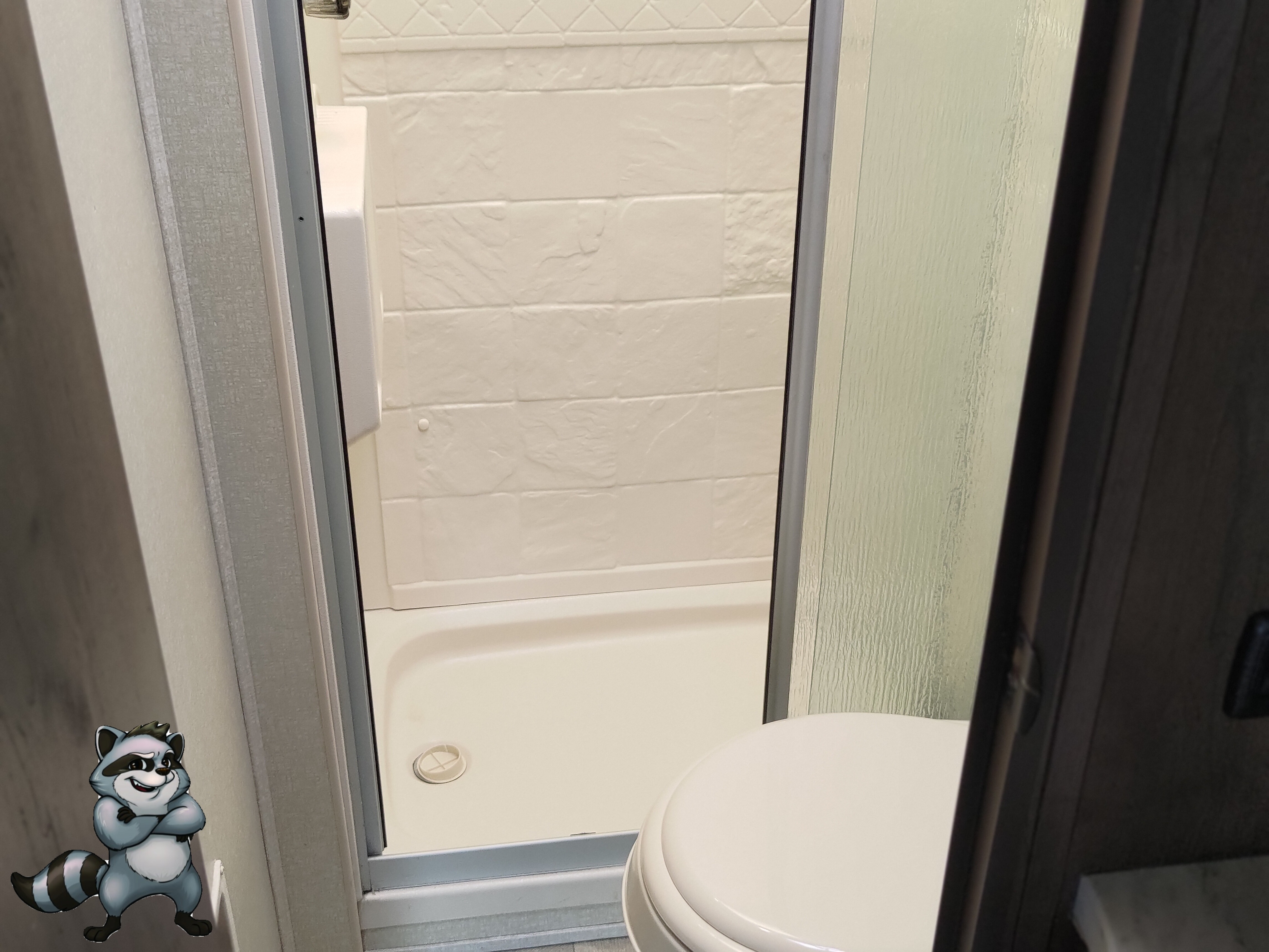 - Walk-In Shower, porcelain toilet, and vanity sink