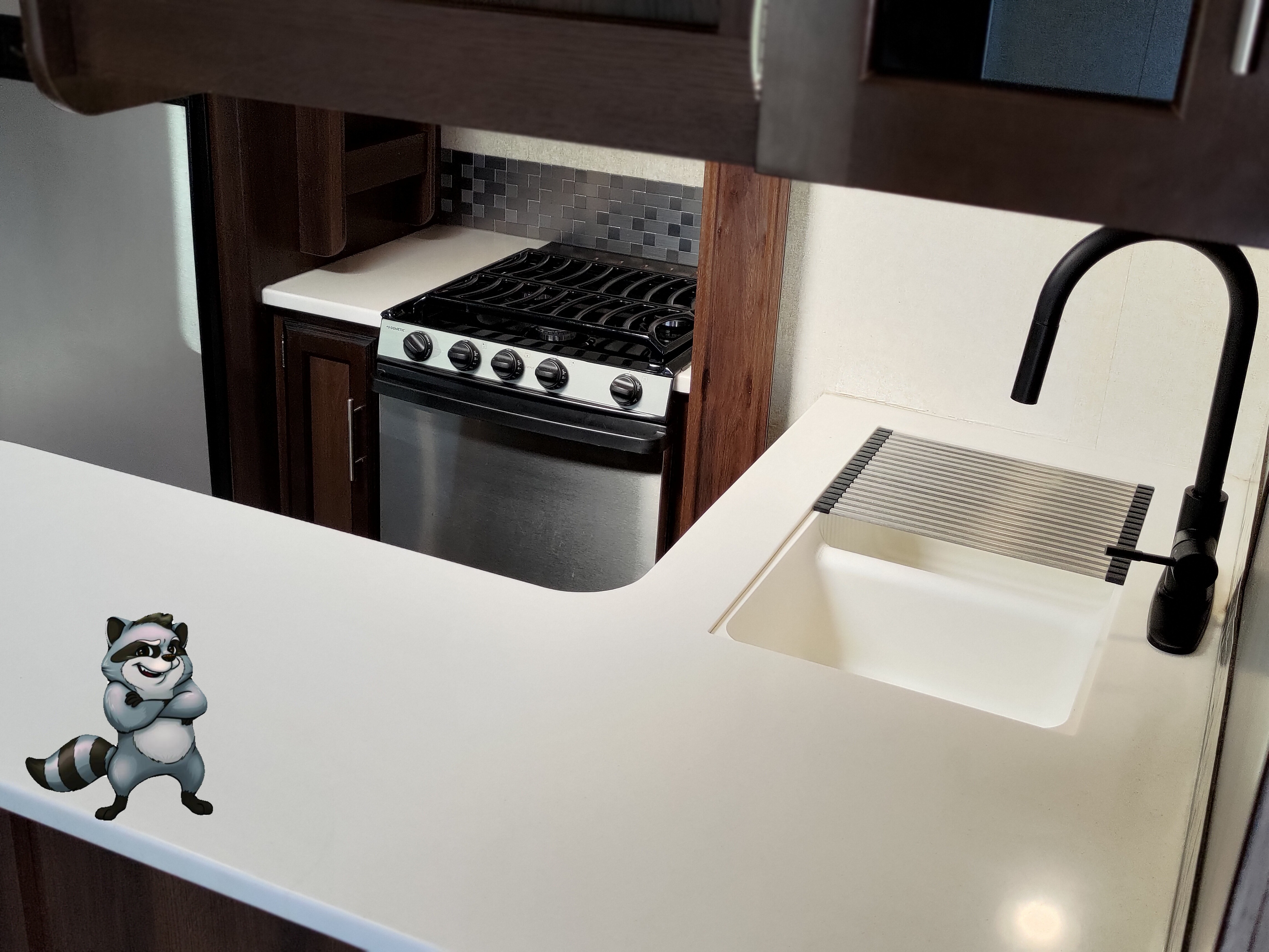 - Solid-Surface Countertops, stainless steel sink, and pull-down sprayer