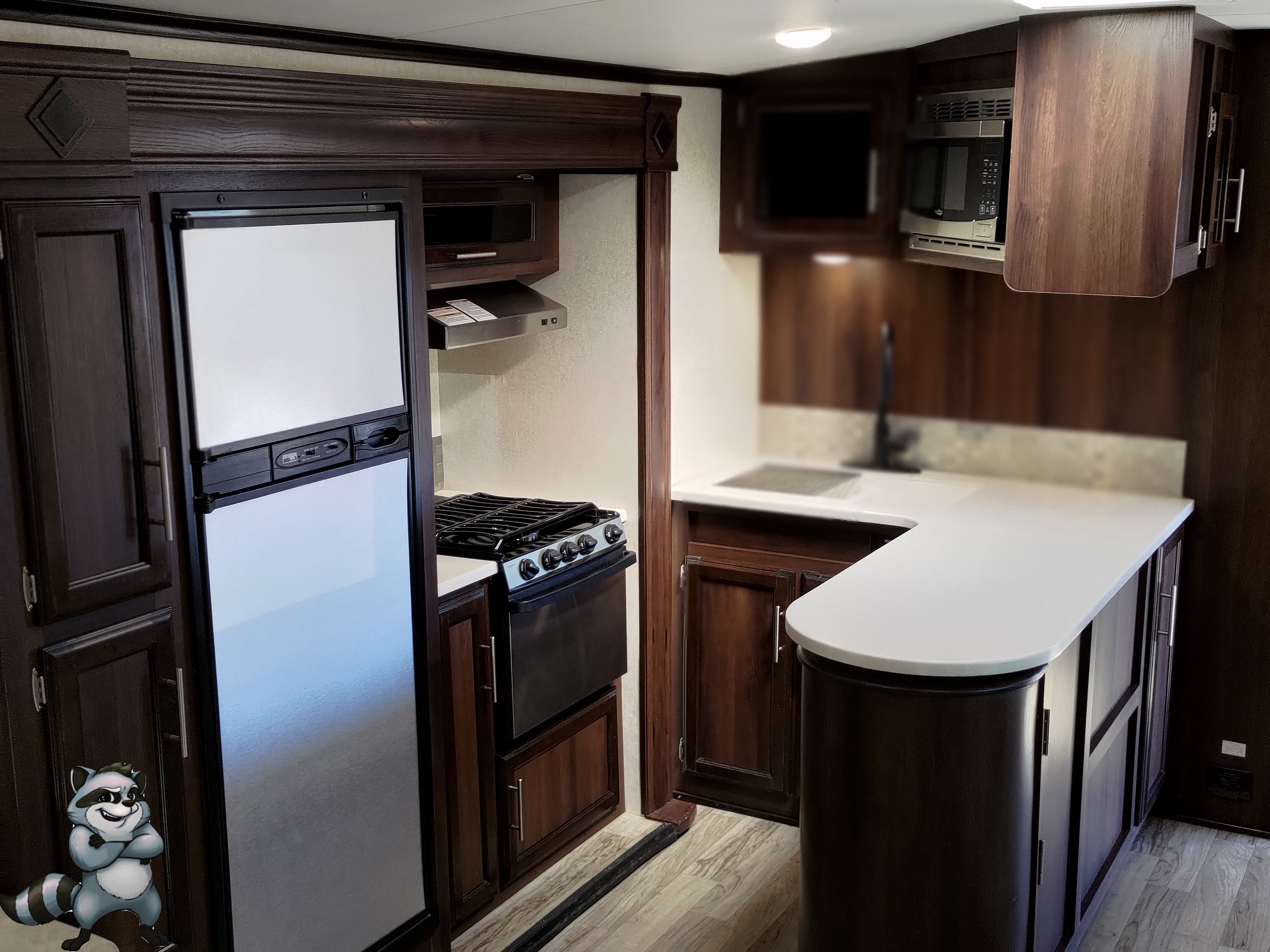 - 3-Burner Range + Oven, microwave, and 8 cu. ft. fridge