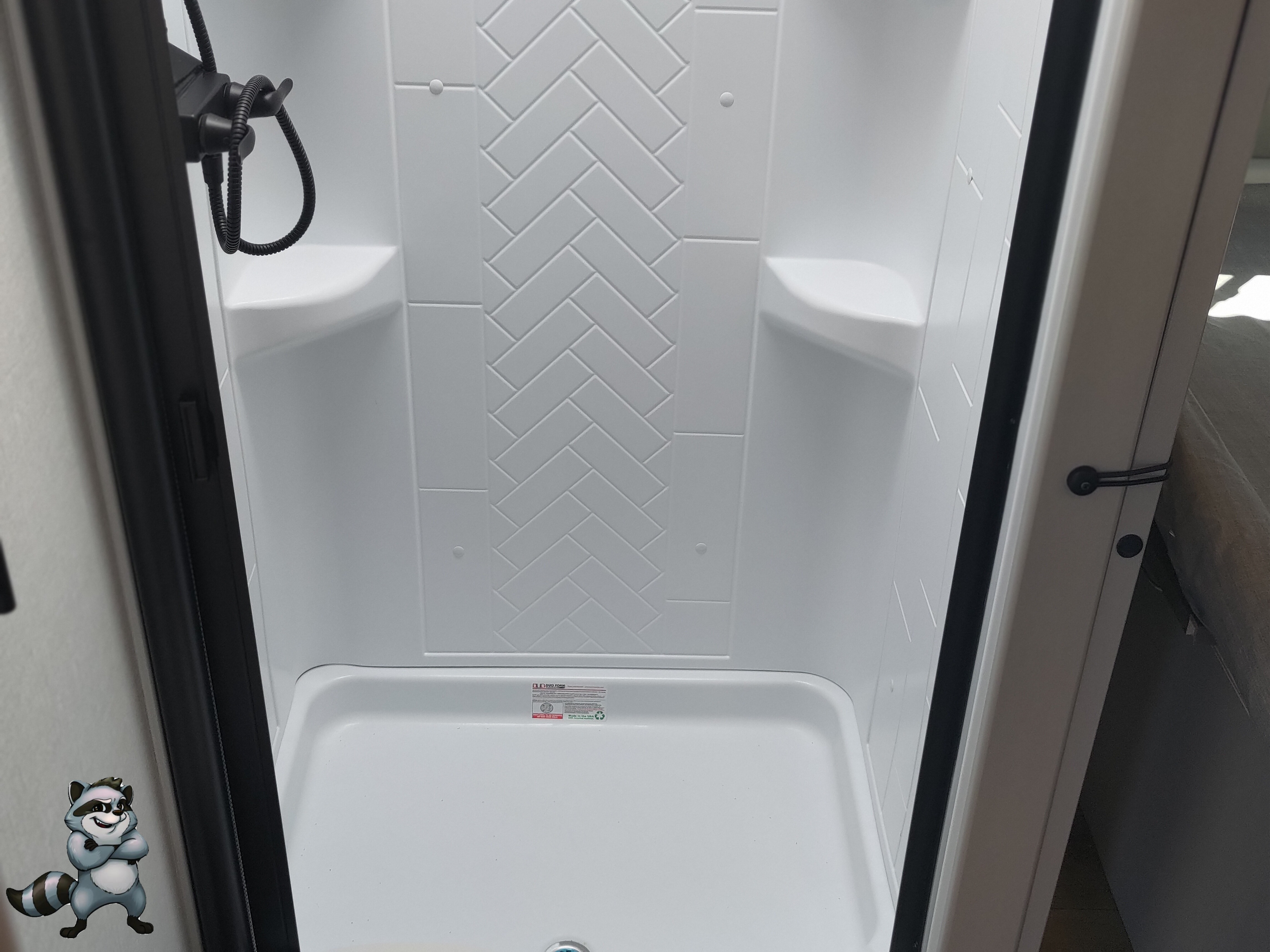 - Porcelain Toilet, fiberglass shower, and mirrored vanity