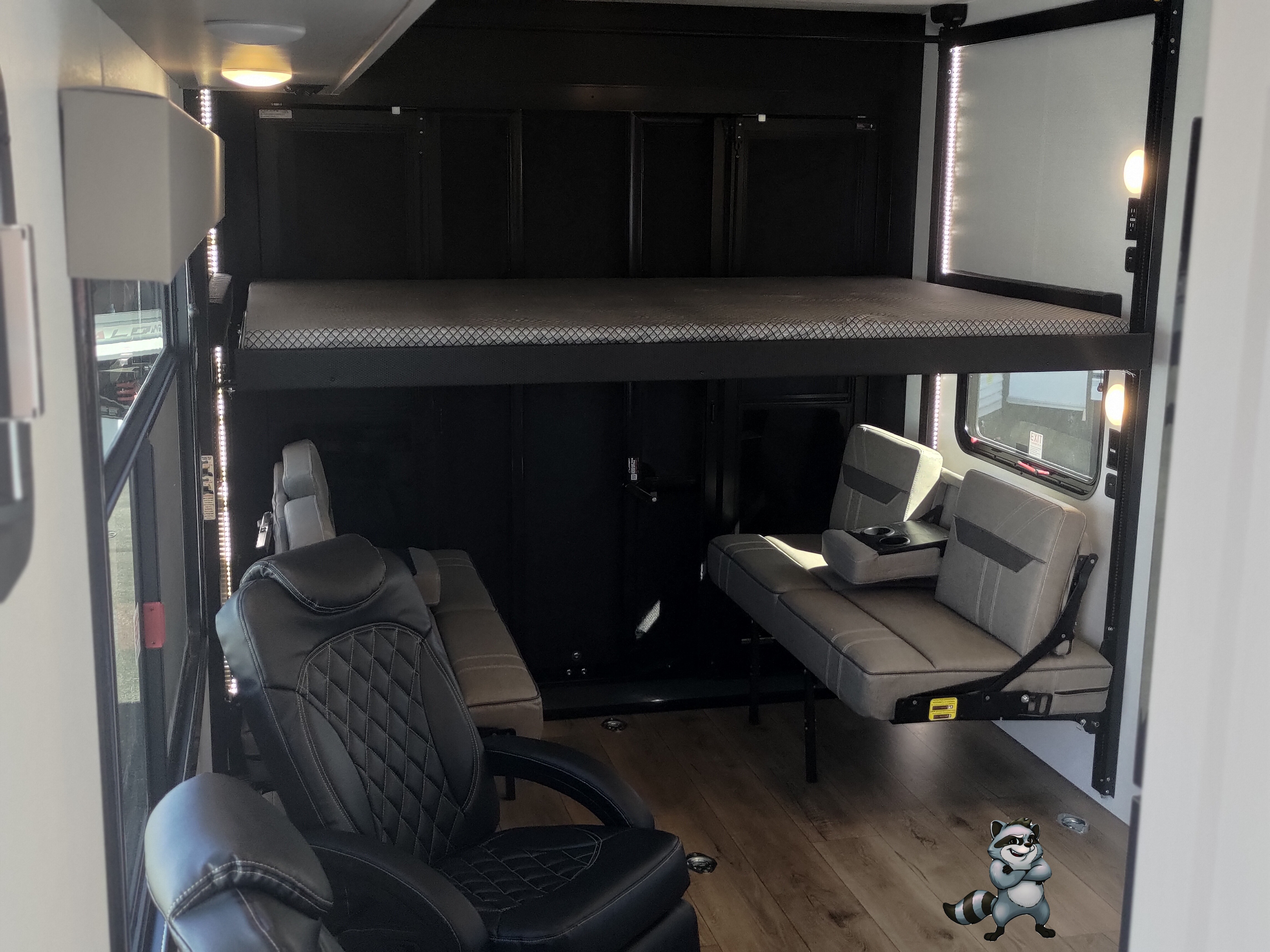 - Garage Area with HappiJac® rollover sofas and drop-down queen bed
