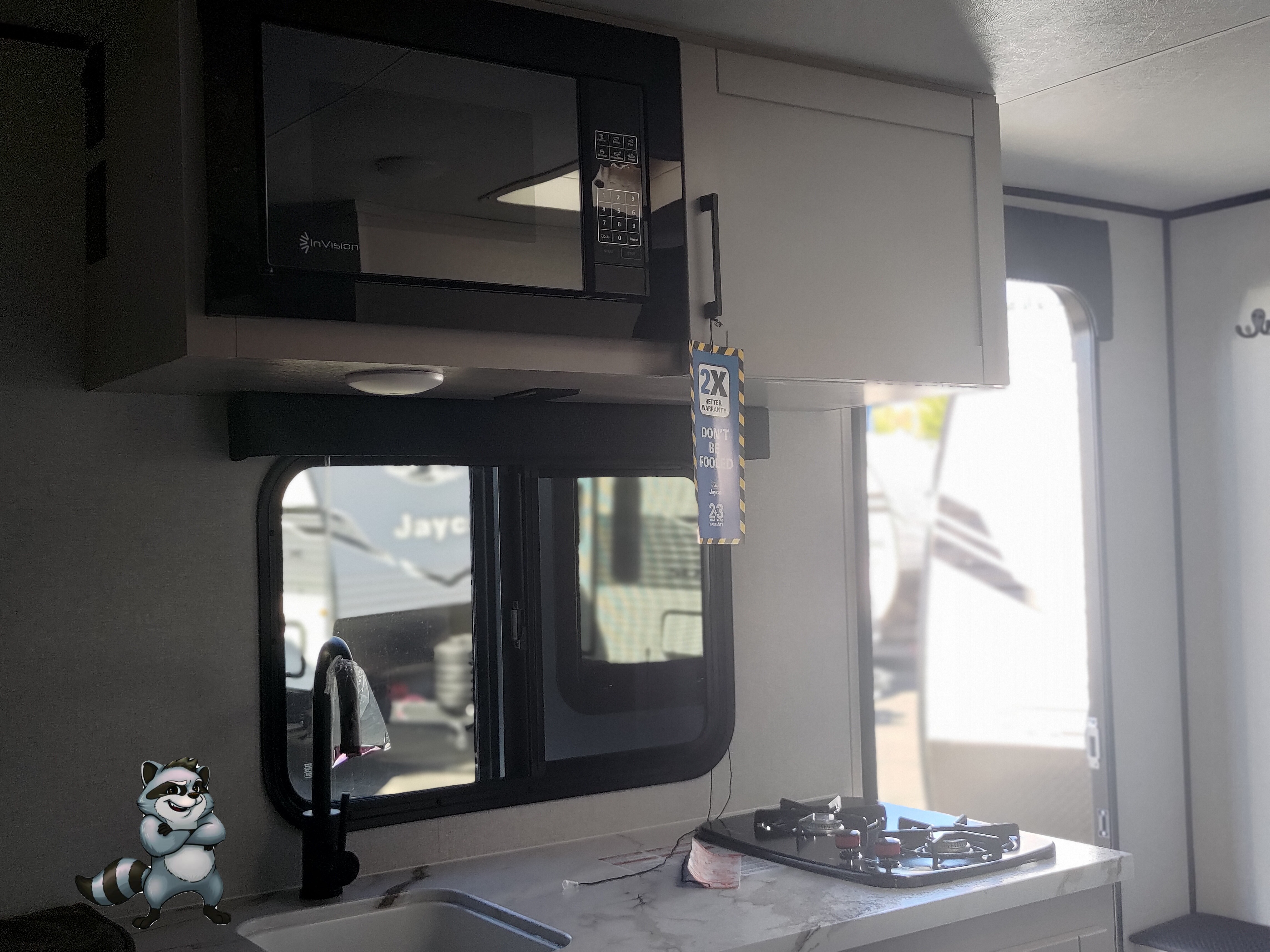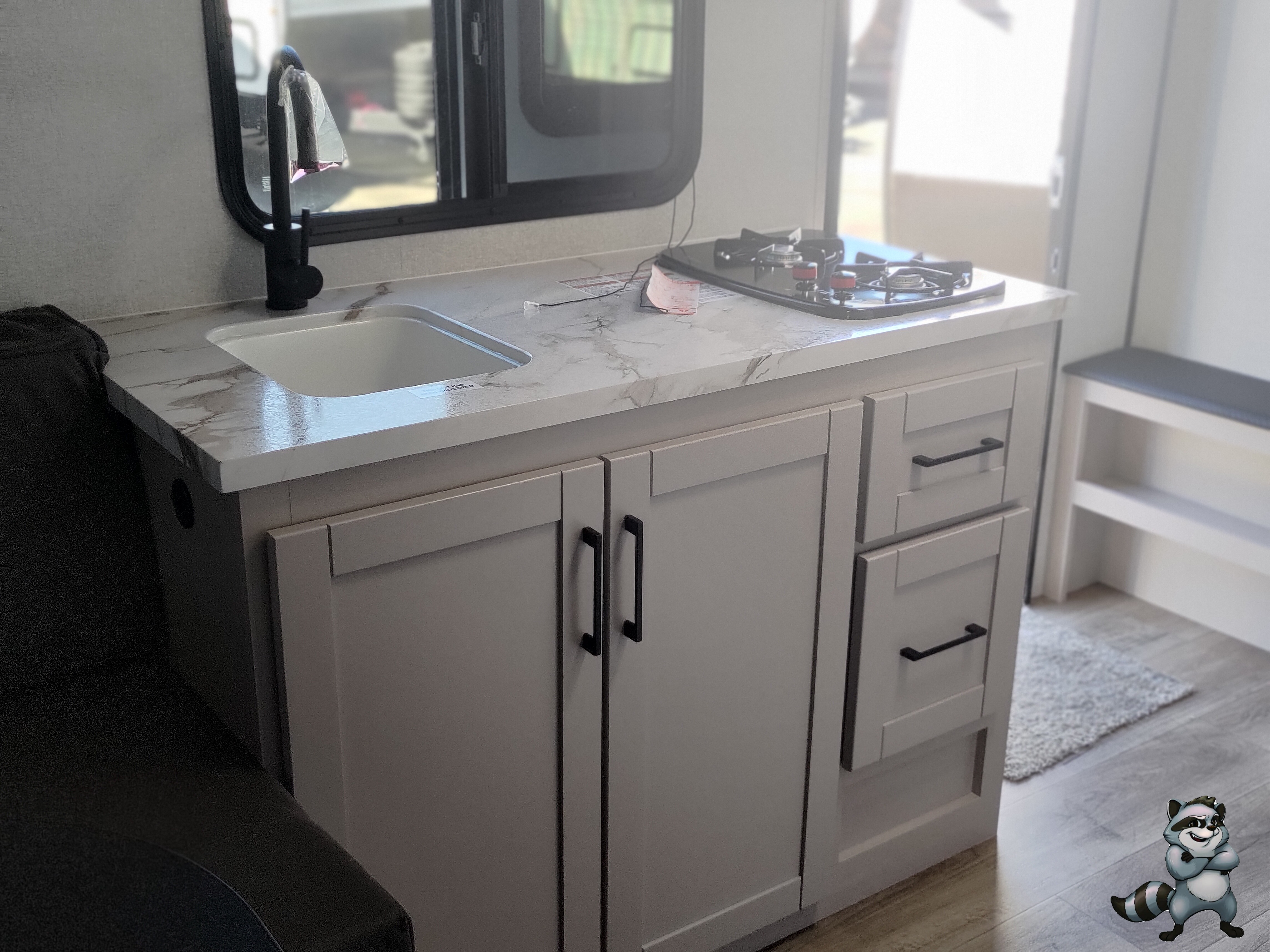 - 2-Burner Cooktop, microwave, and 12V glass-front refrigerator