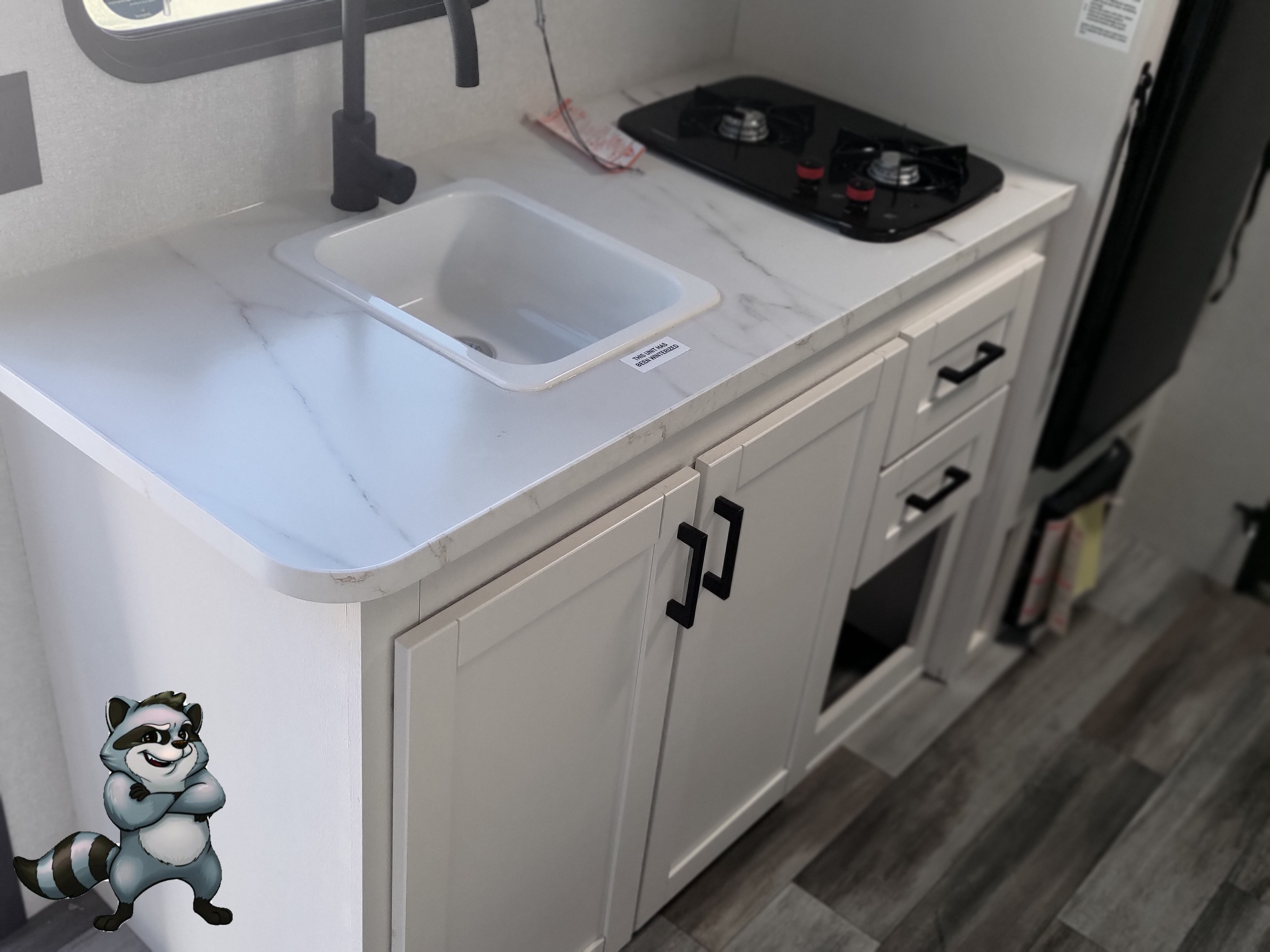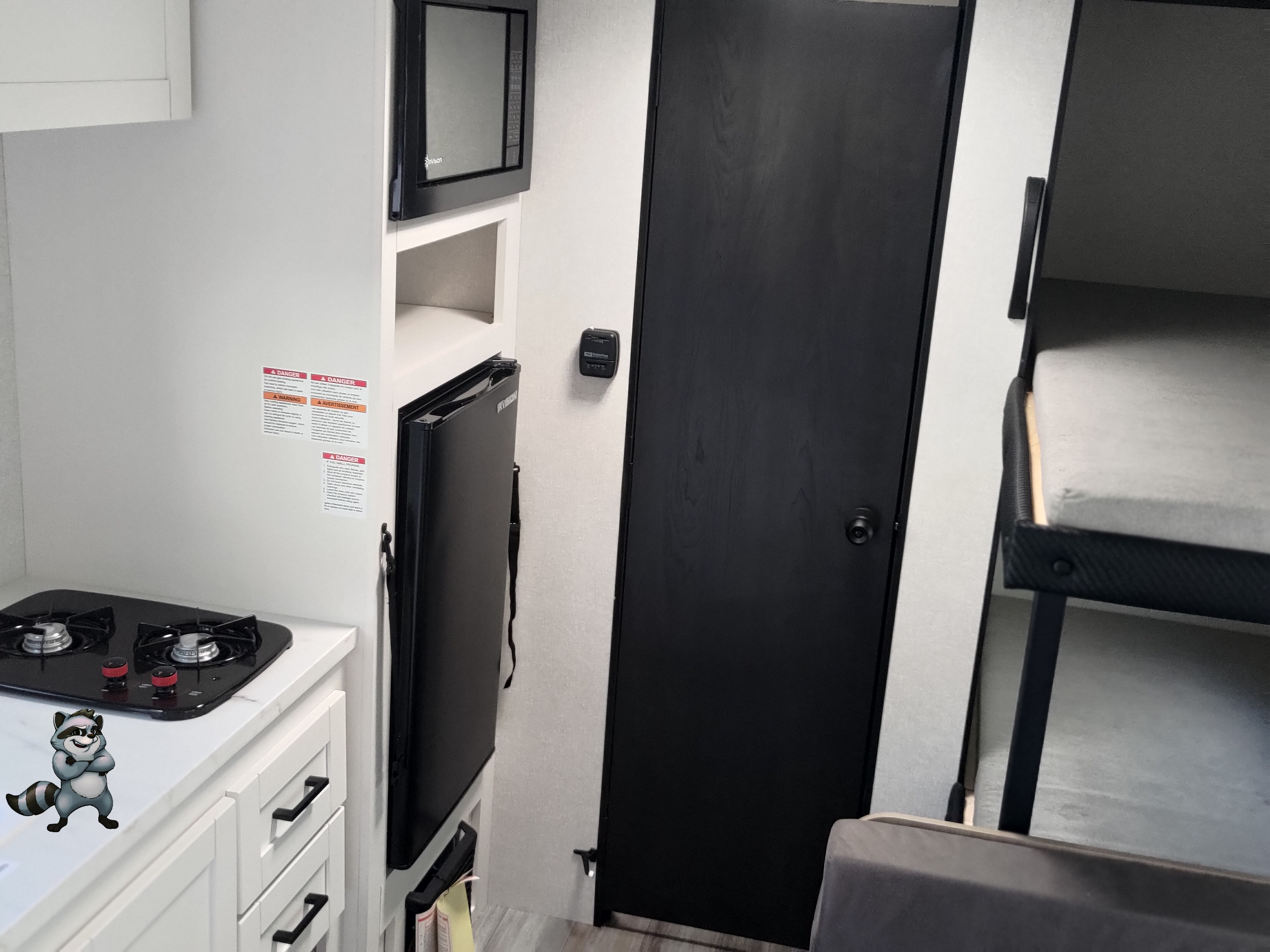 - 12V Glass-Front Fridge, 2-burner cooktop, and microwave