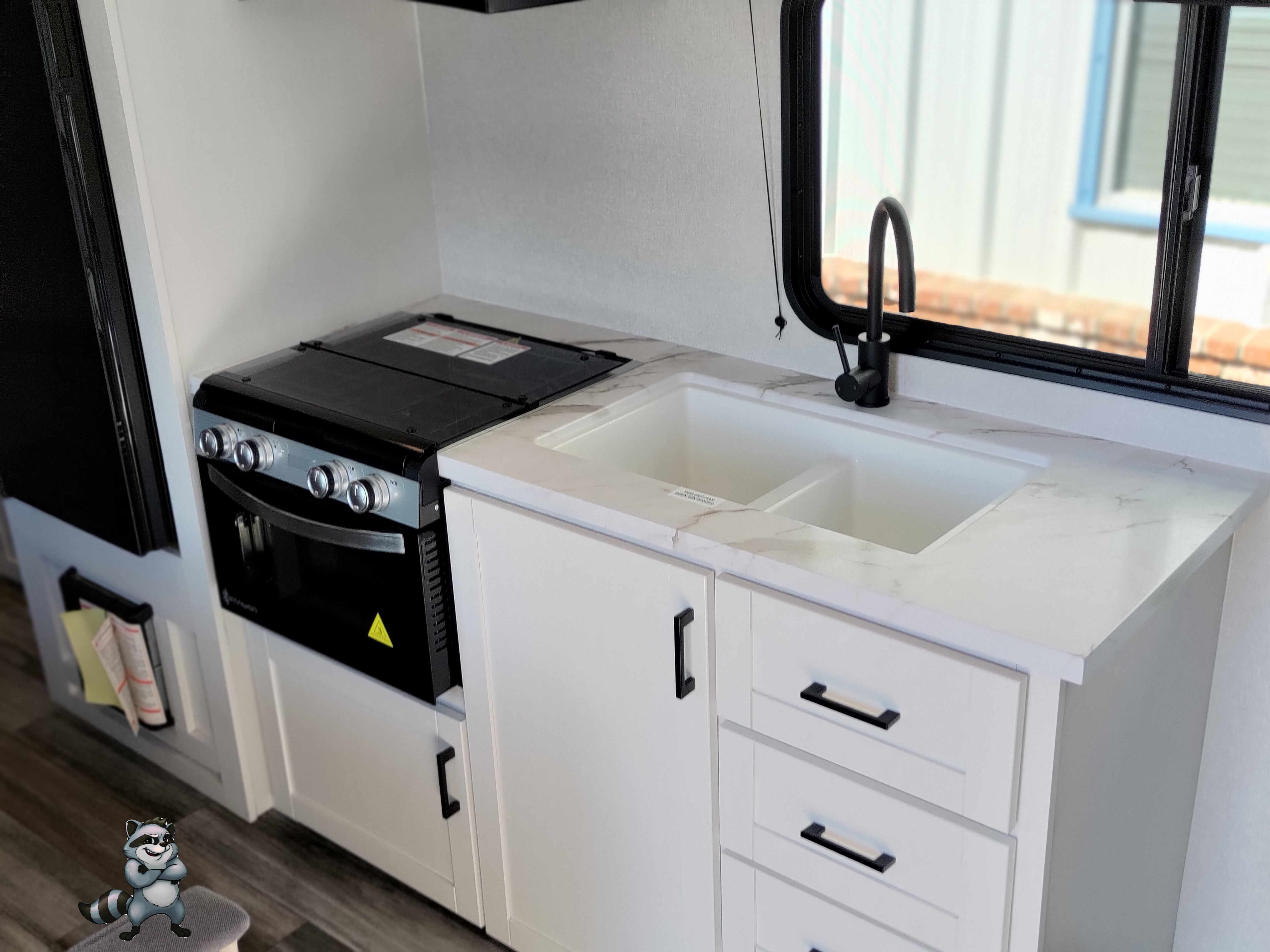 - 12V Glass-Front Fridge, 3-burner range with oven, and microwave