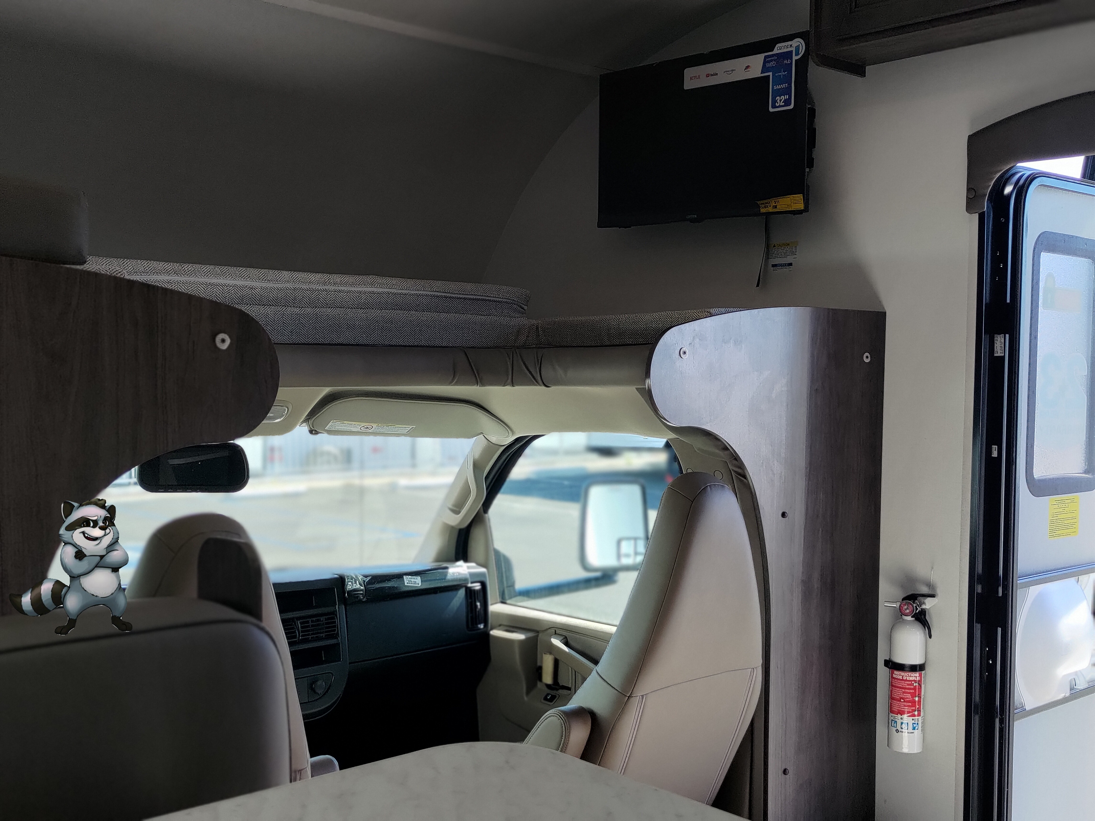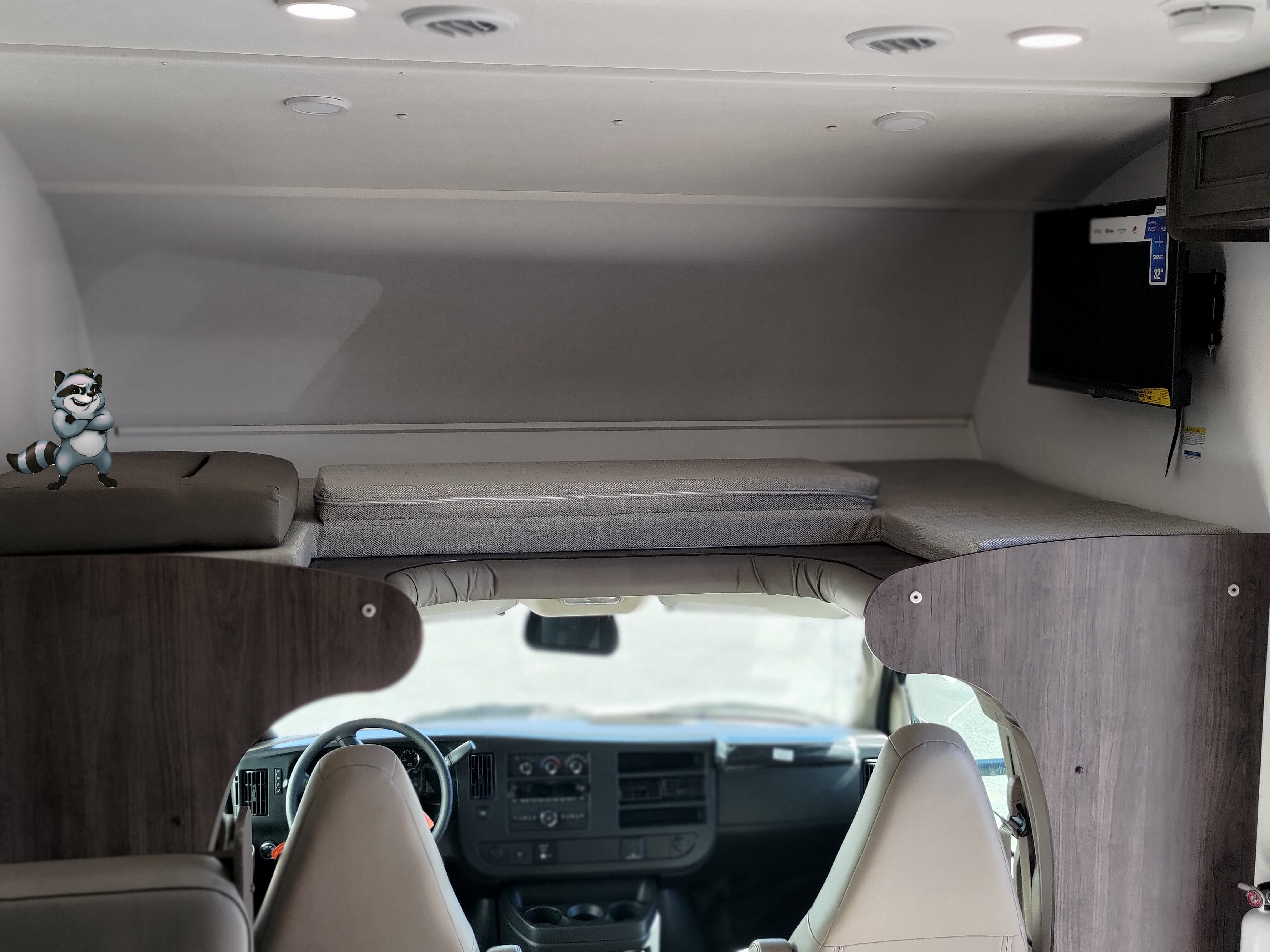 - Overhead Cab Bunk with panoramic front window and safety net