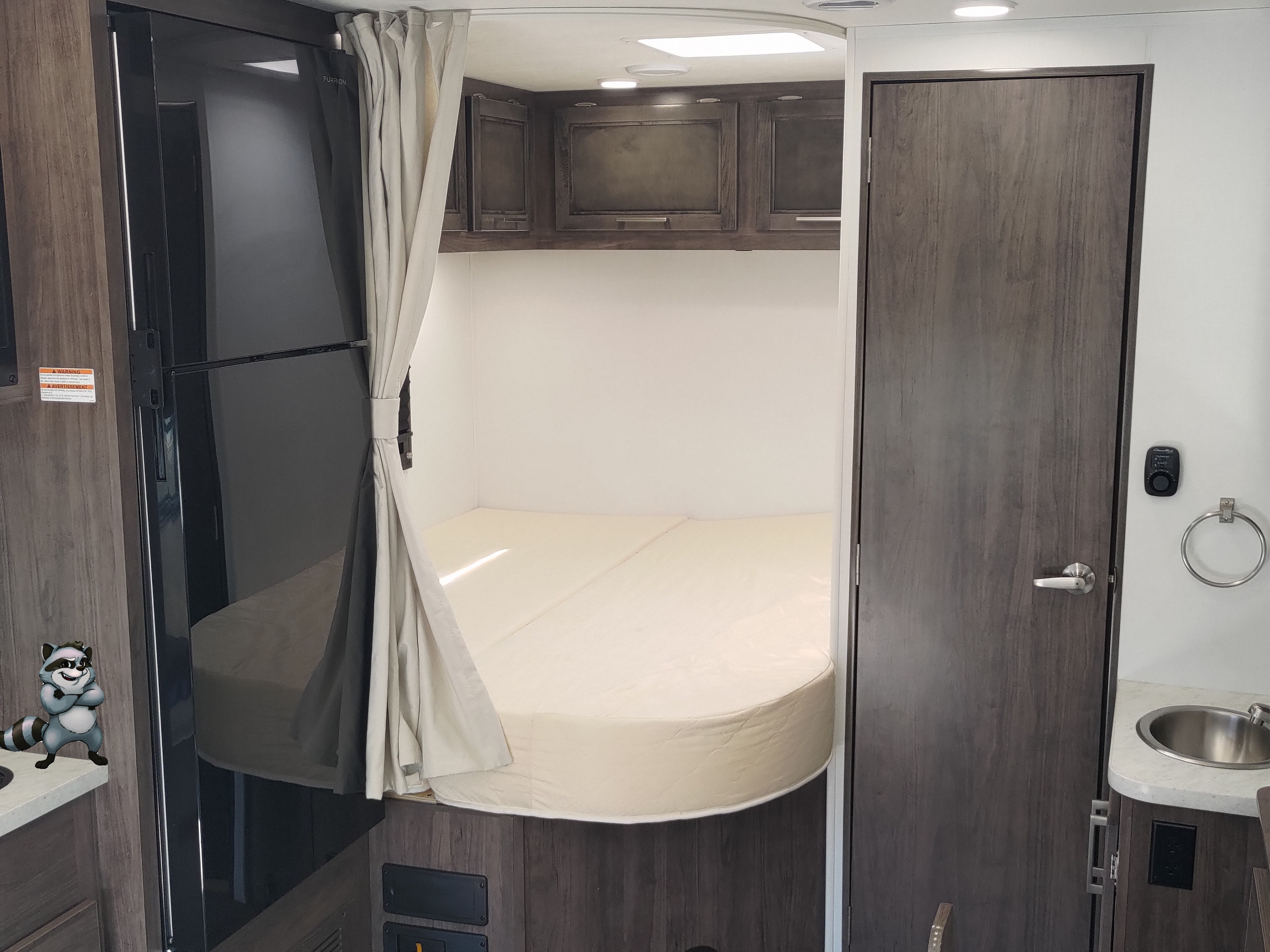 - Rear Queen Bed with overhead cabinets and bedside wardrobe