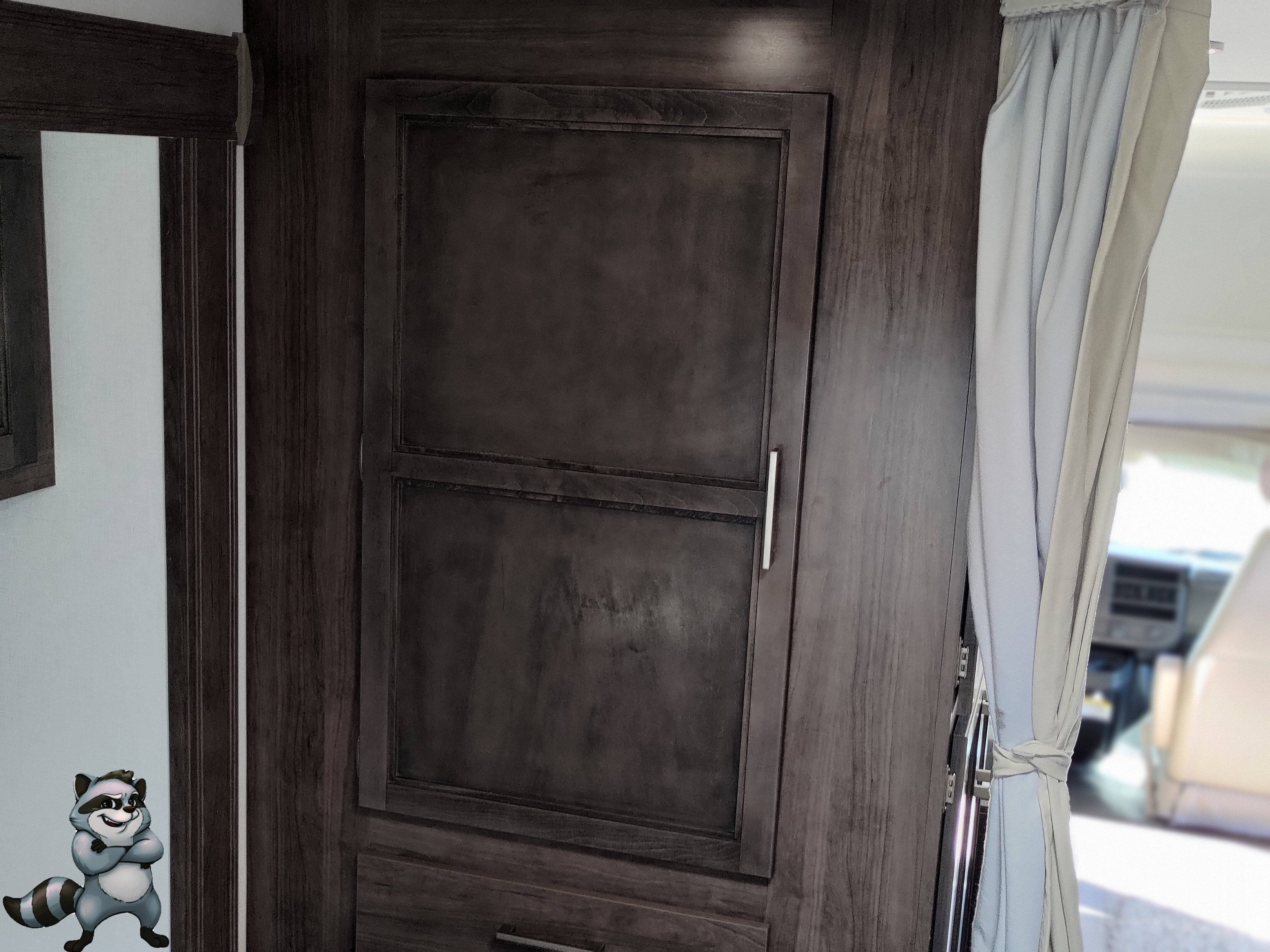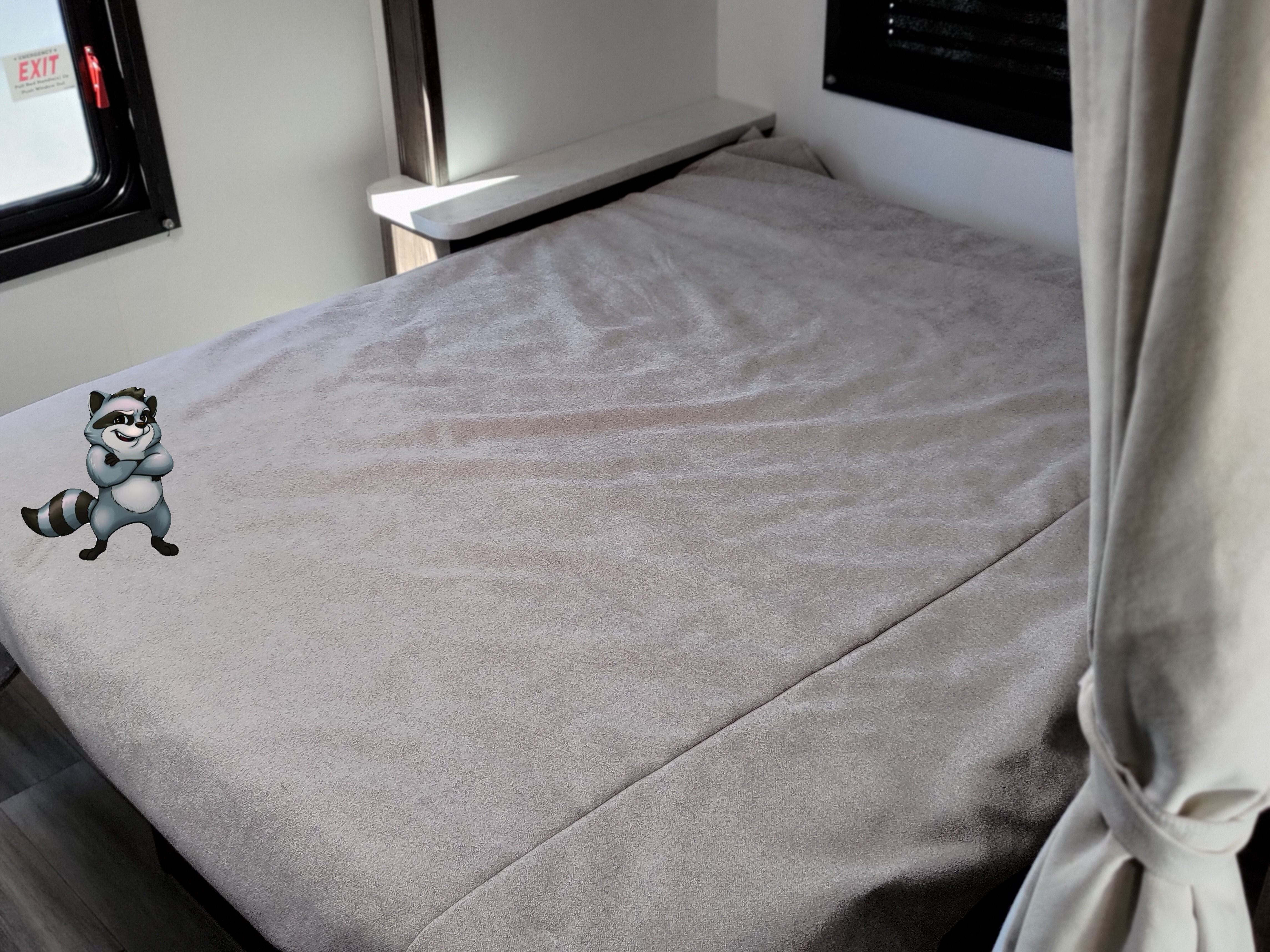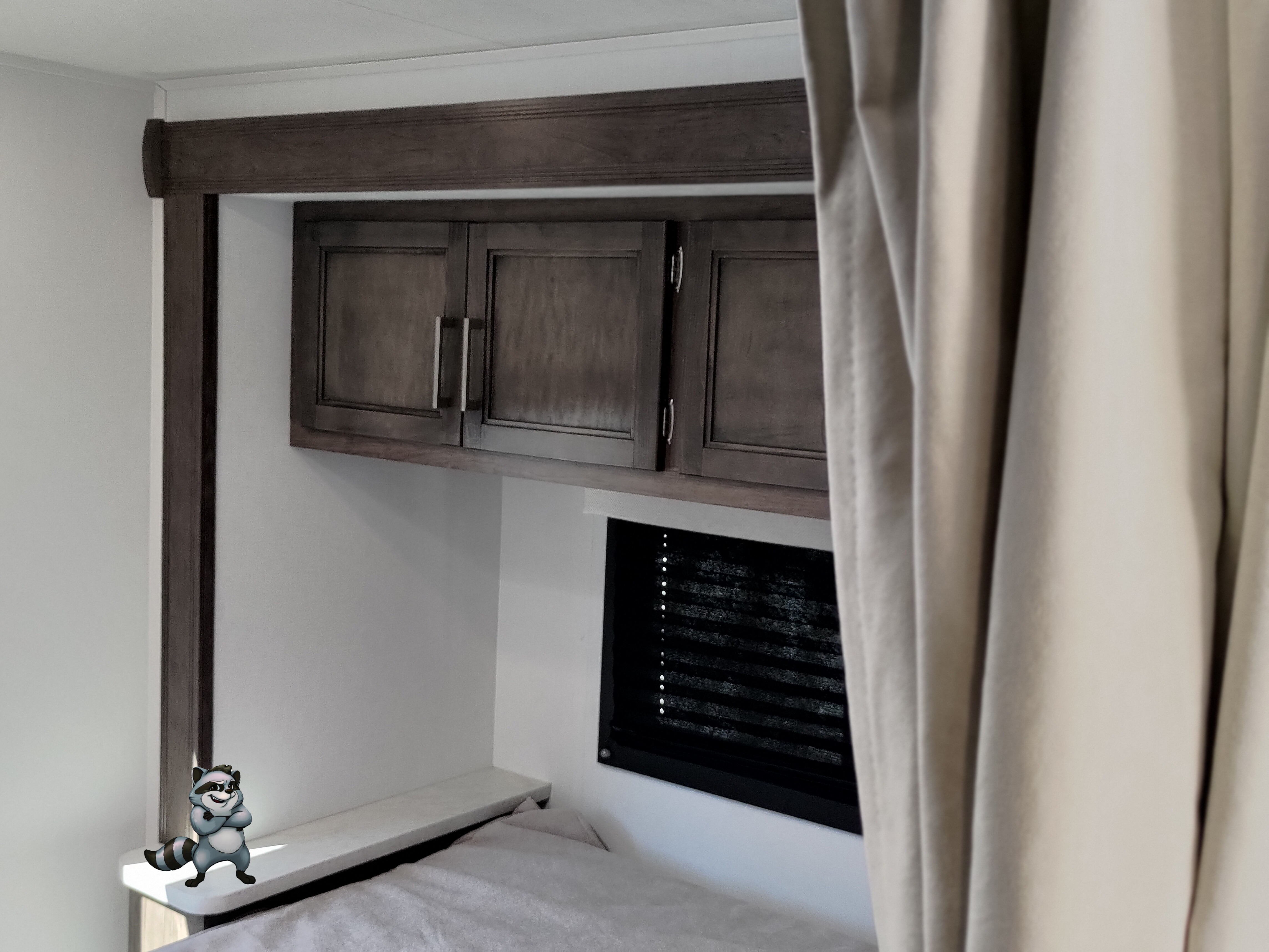 - Queen Bed Slide-Out with overhead cabinets and privacy curtain