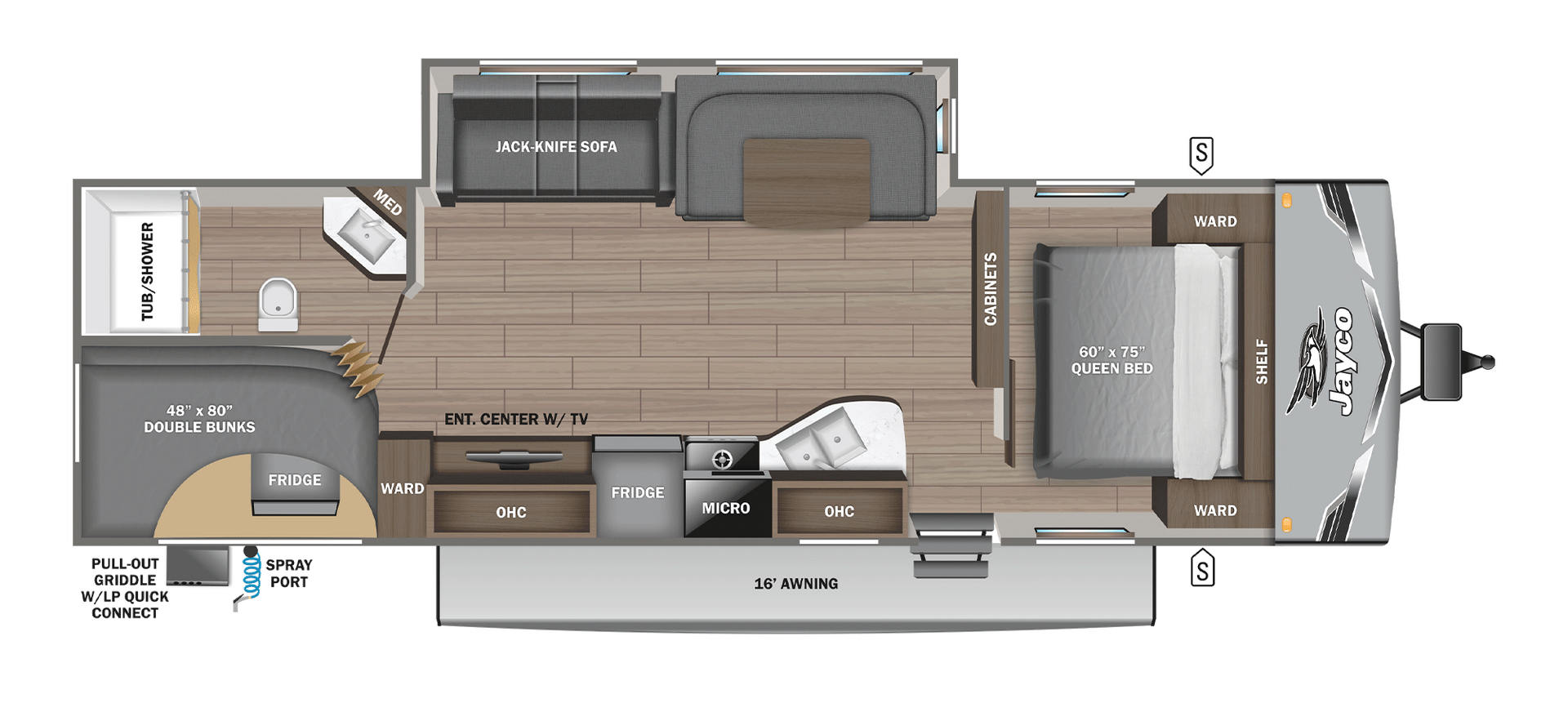 - Jack‑Knife Sofa + U‑Shaped Dinette (both convert for extra sleeping space)