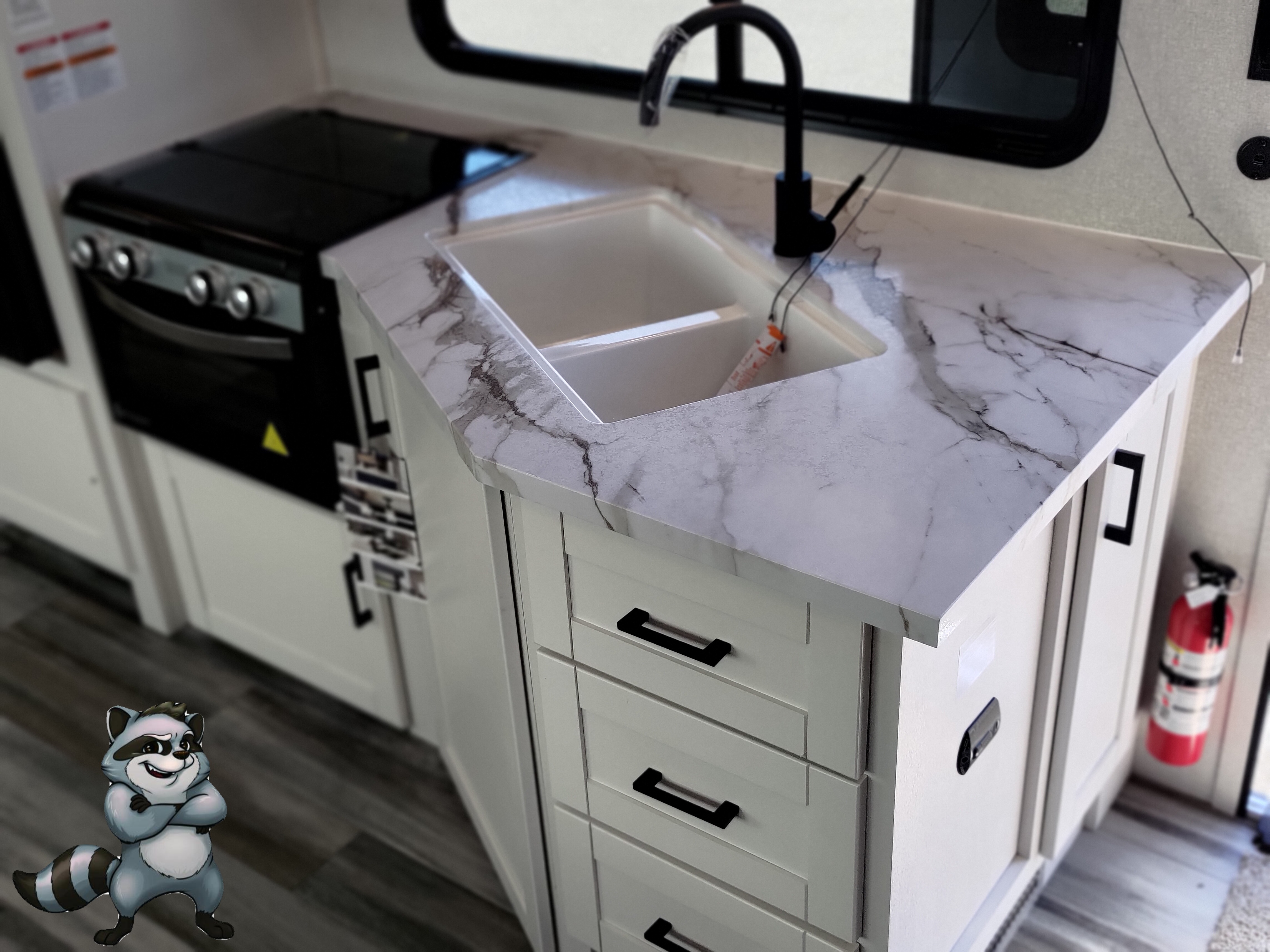 - 12V Glass-Front Fridge, 3-burner range with oven, and microwave
