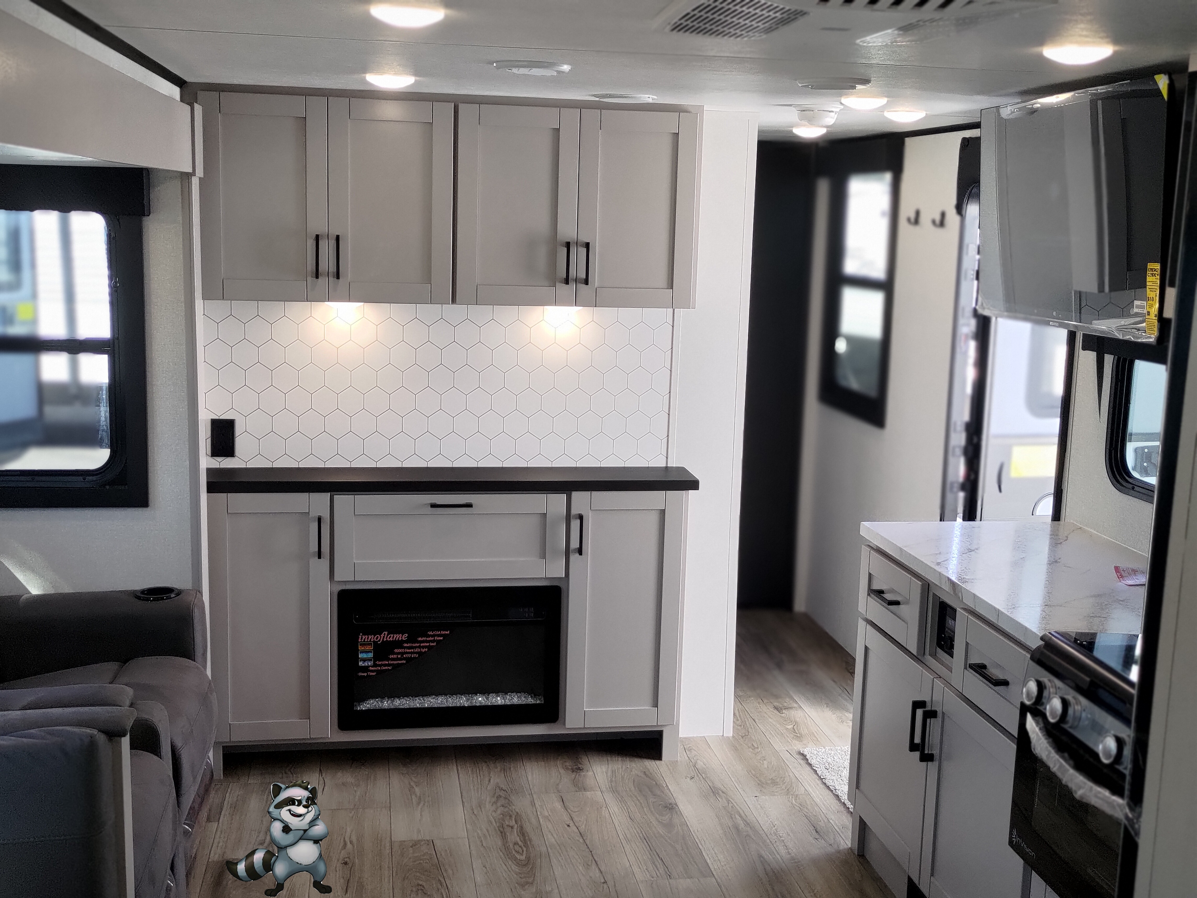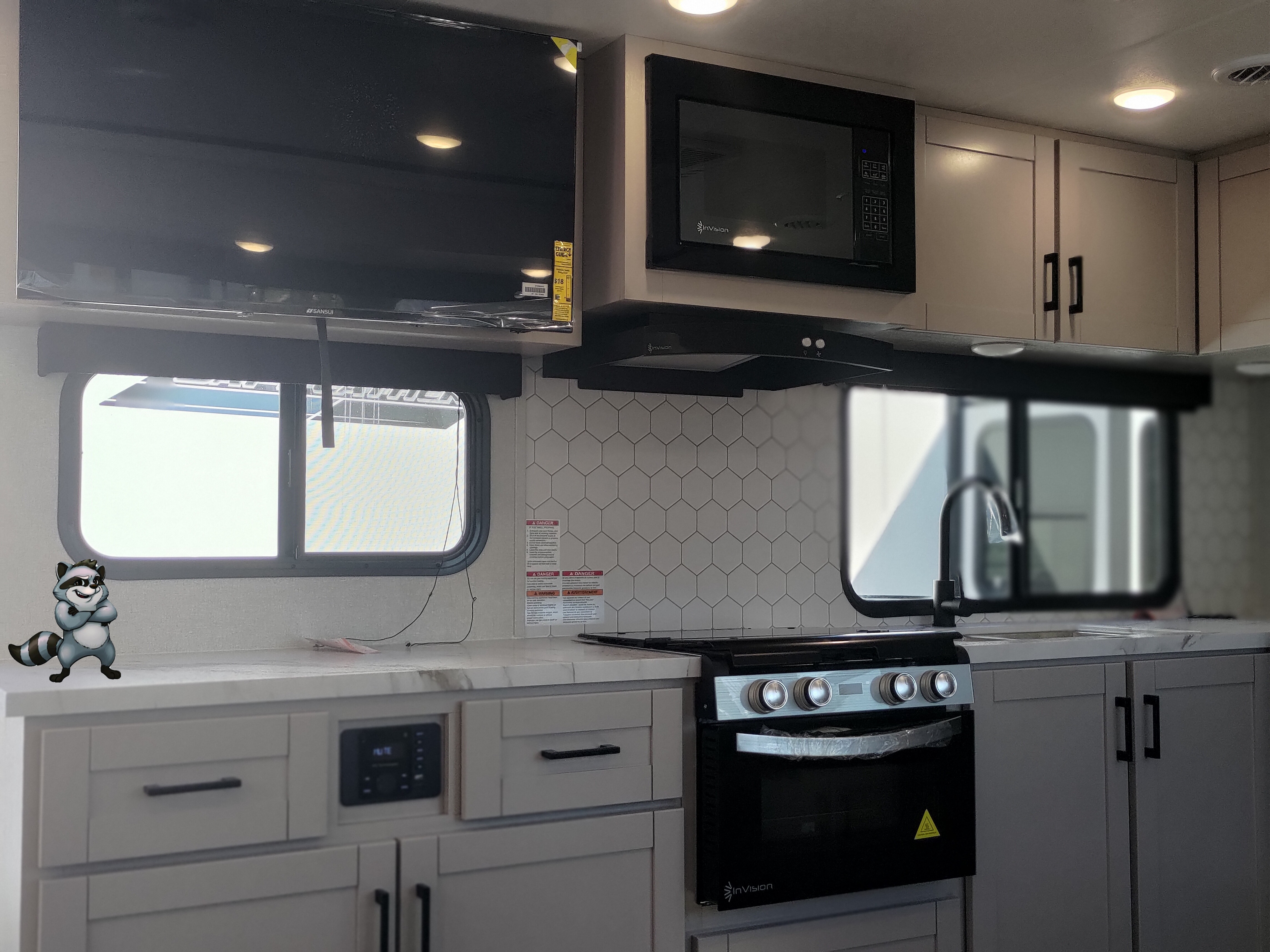 - 12V Glass-Front Fridge, 3-burner range with oven, and microwave