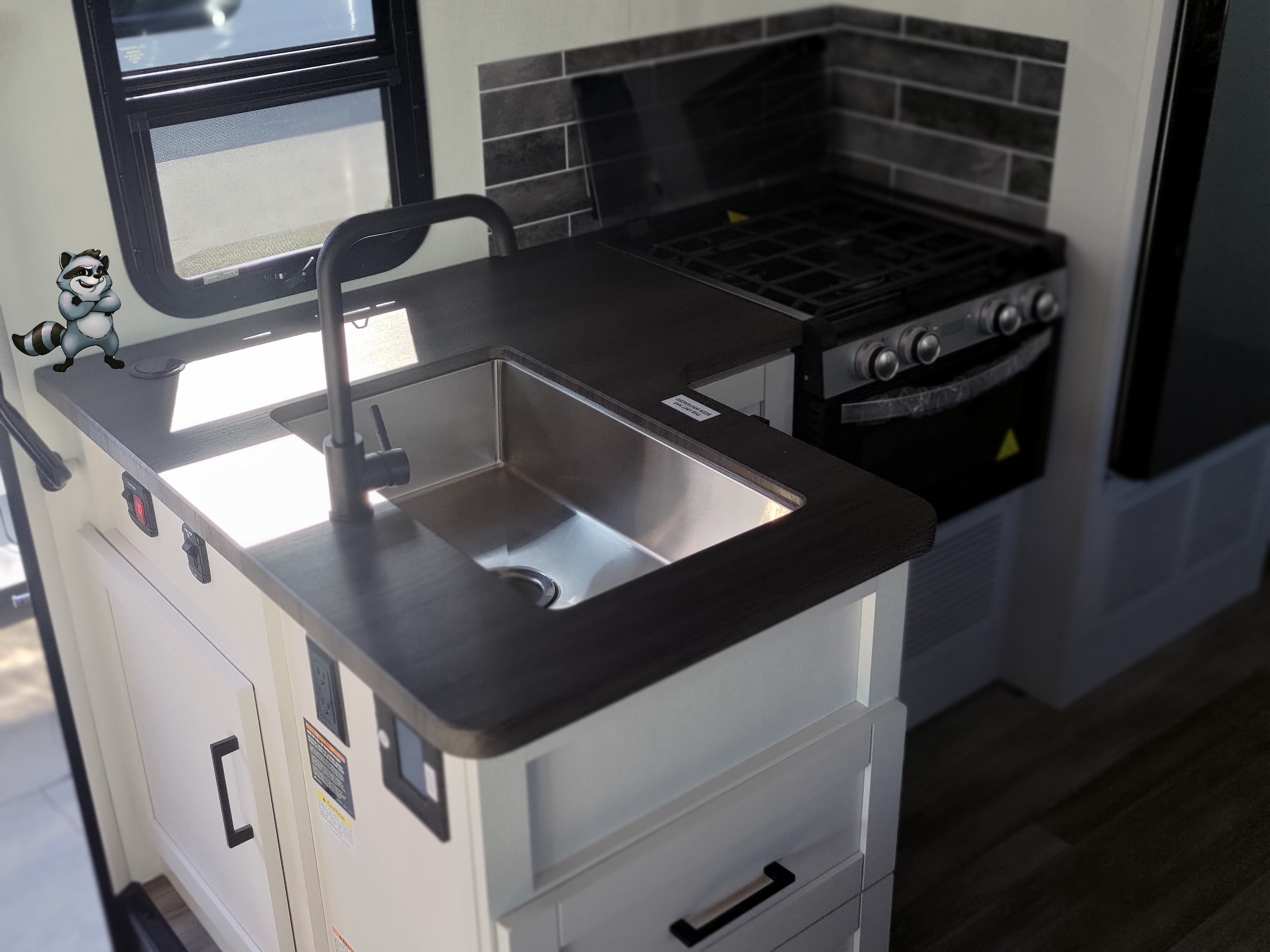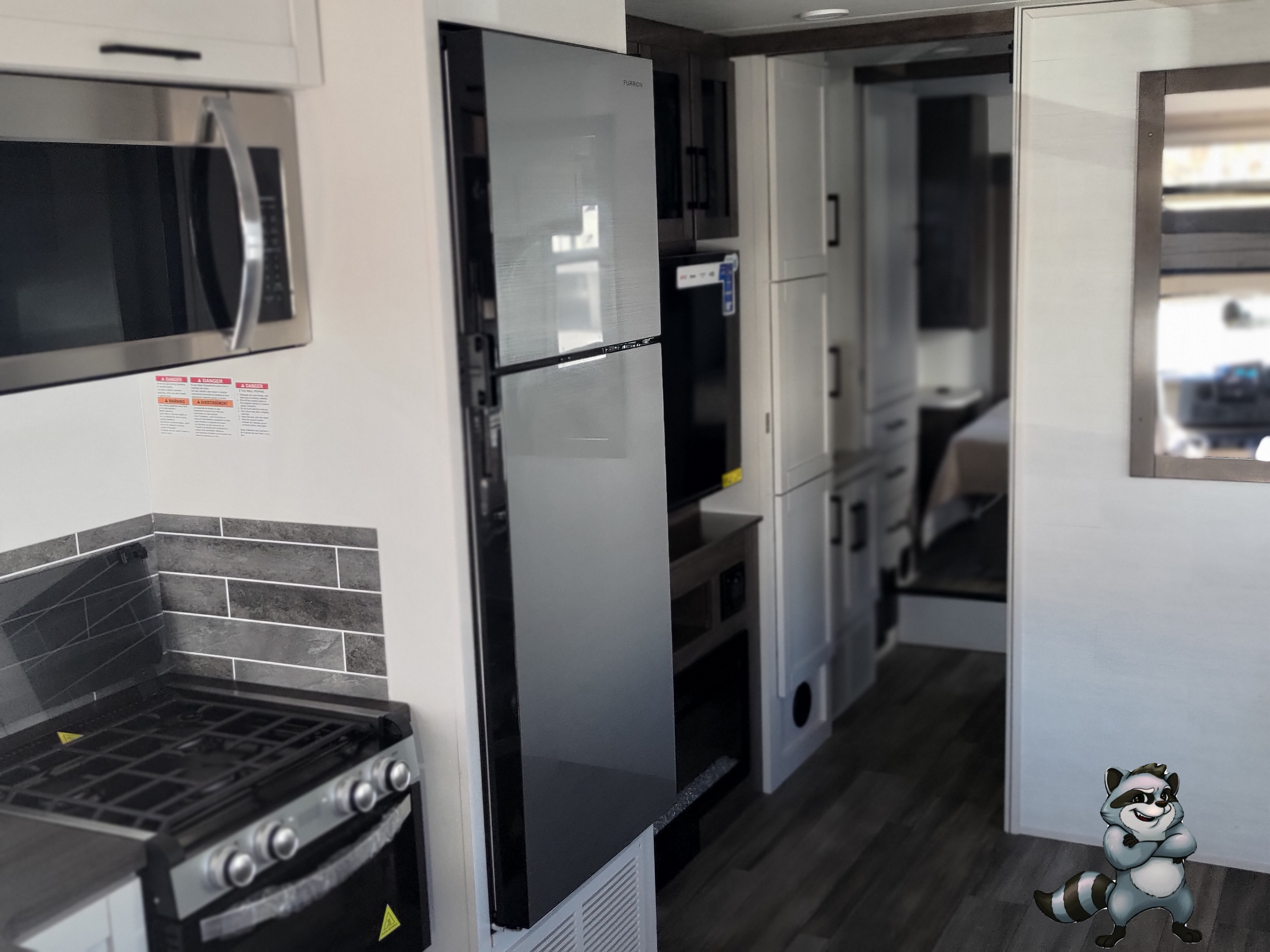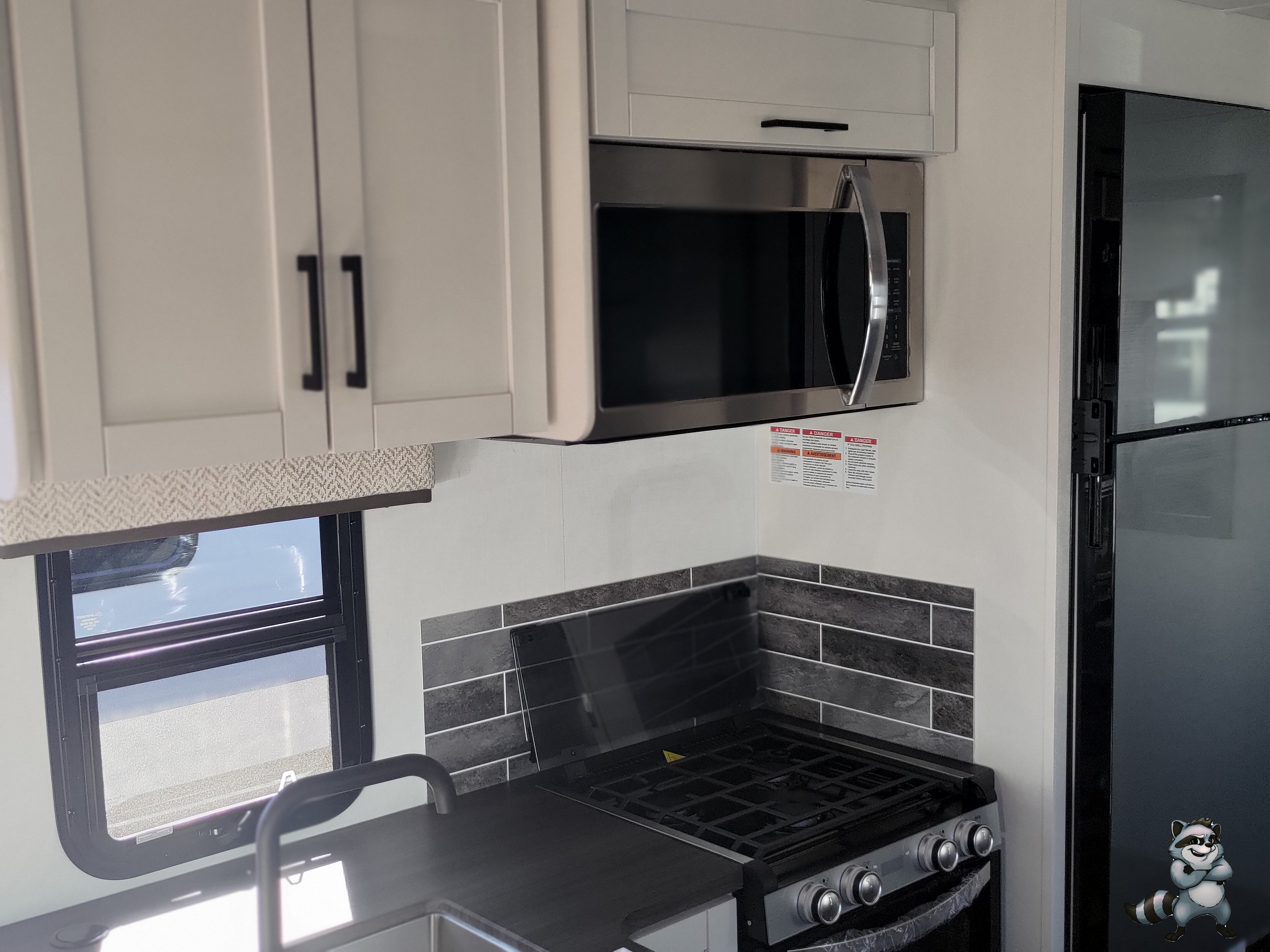 - 12V Glass-Front Fridge, 3-burner range with oven, and microwave