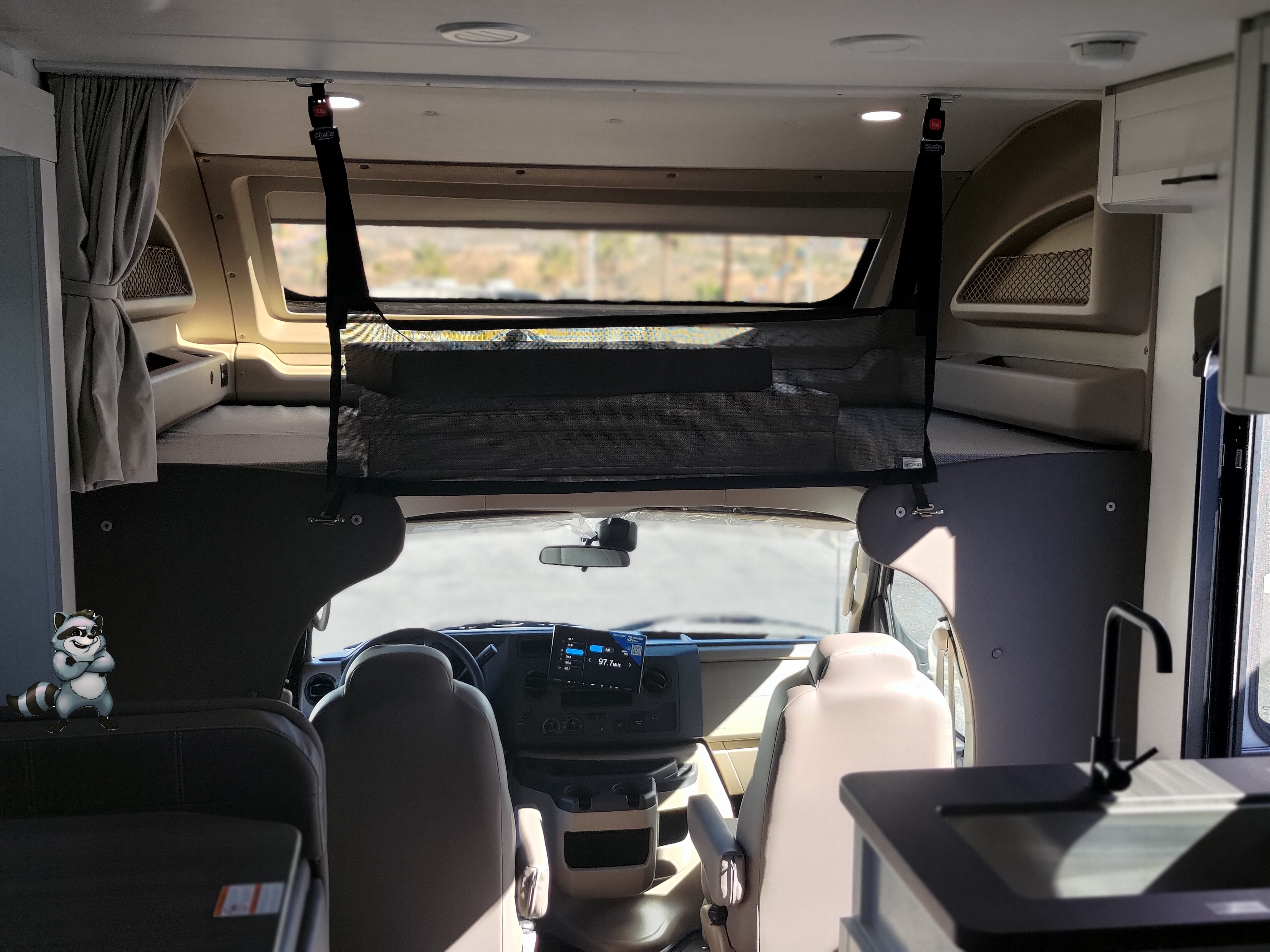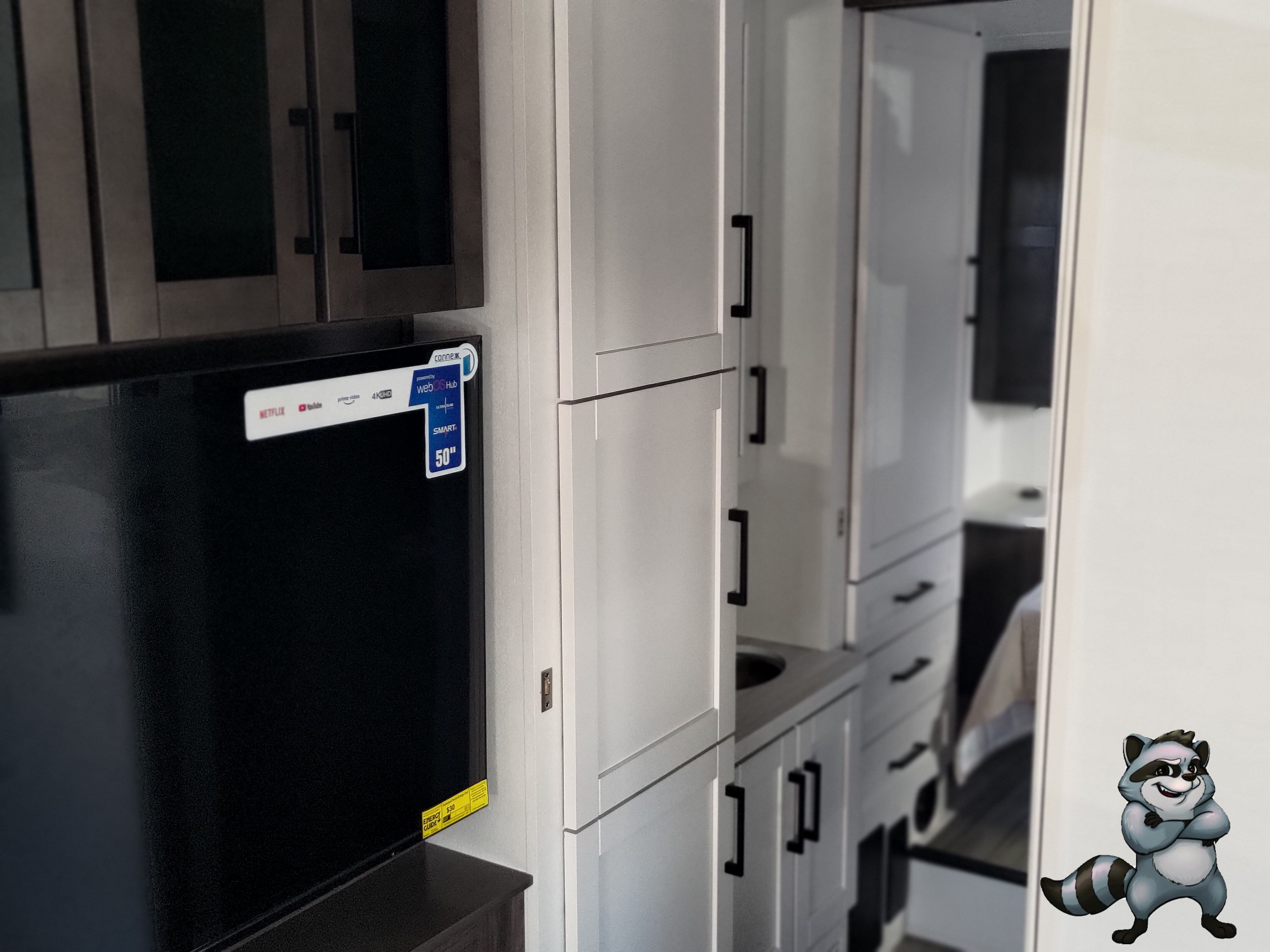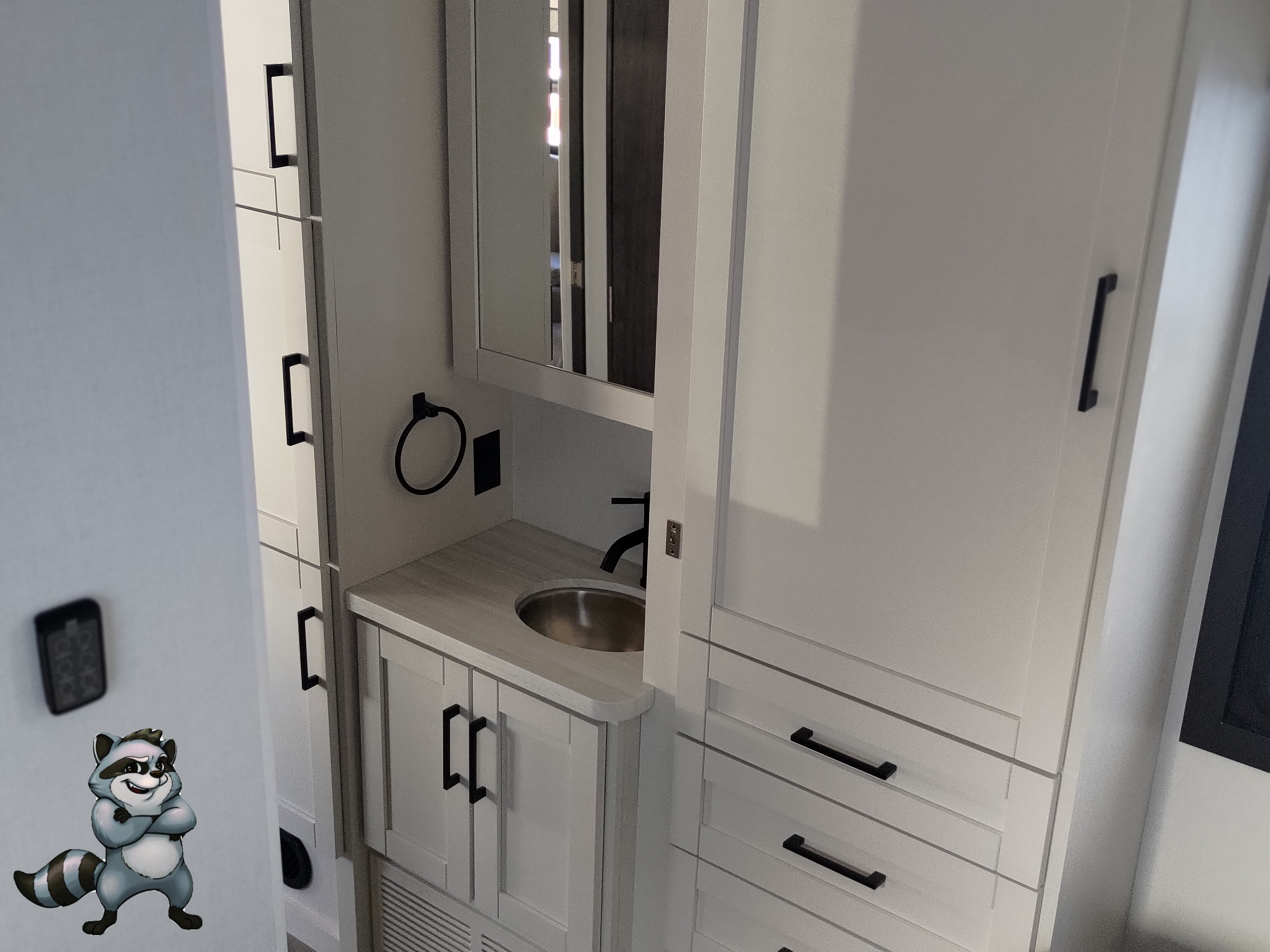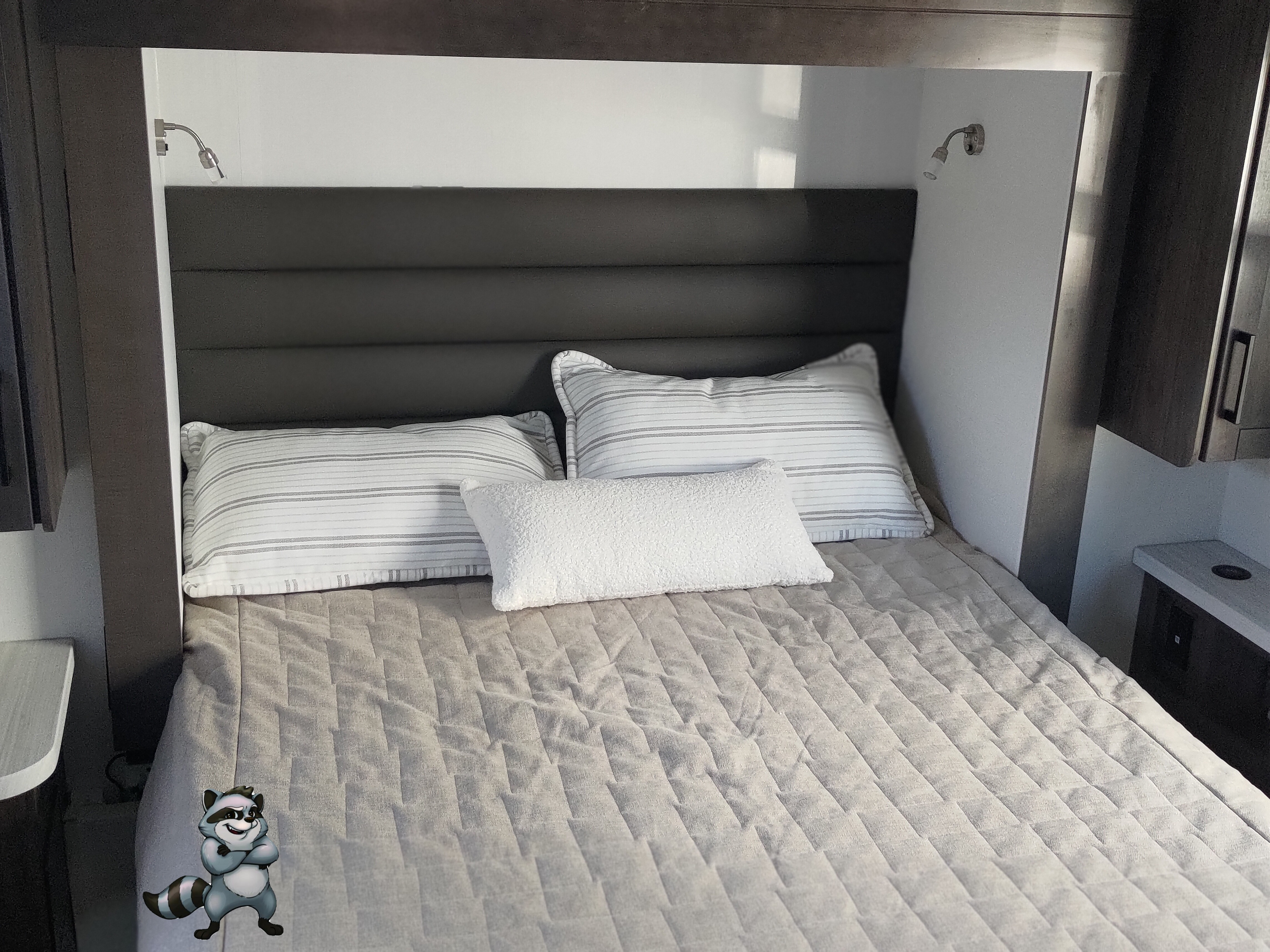 - Private Rear Queen Bedroom with blackout cabinetry, dual wardrobes, and overhead storage