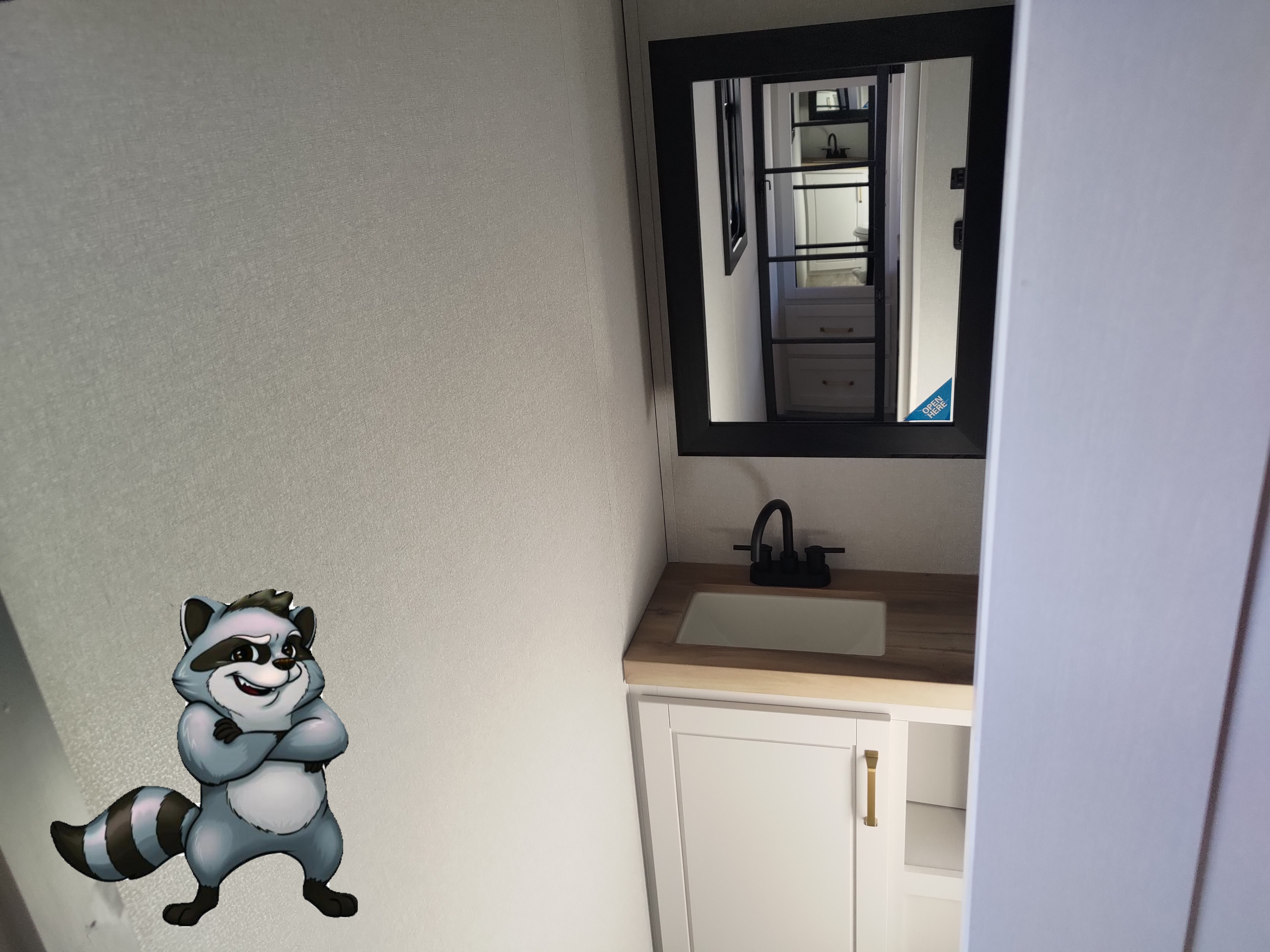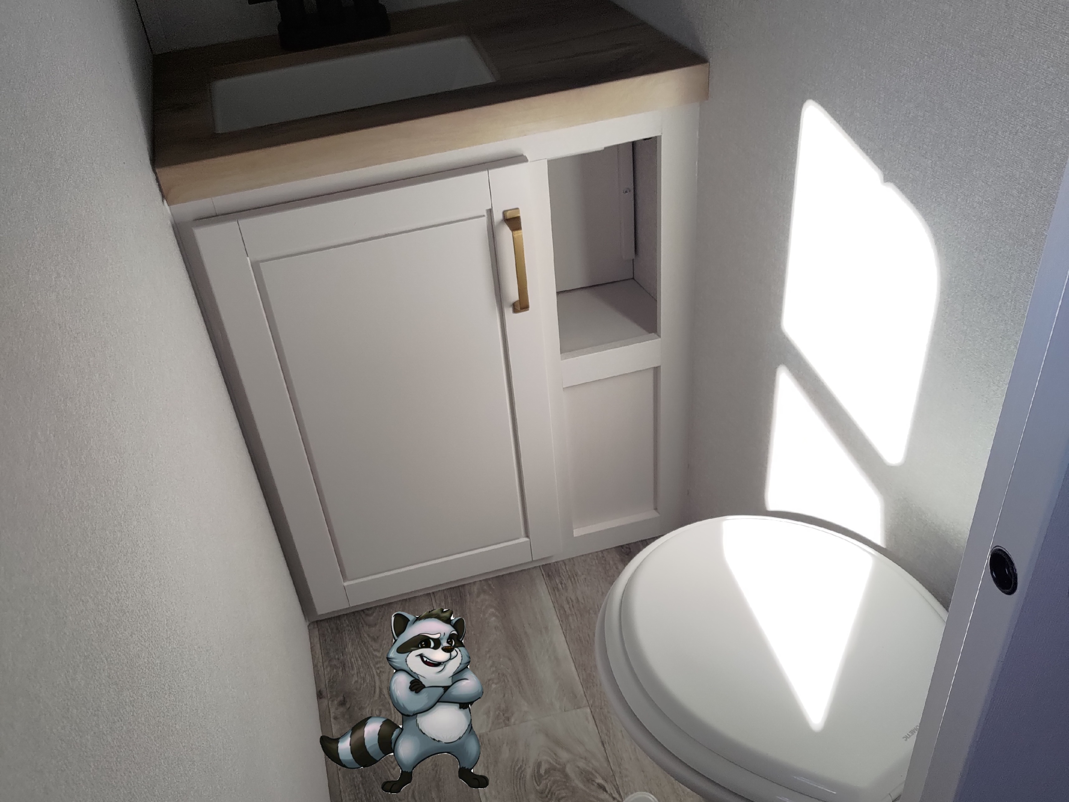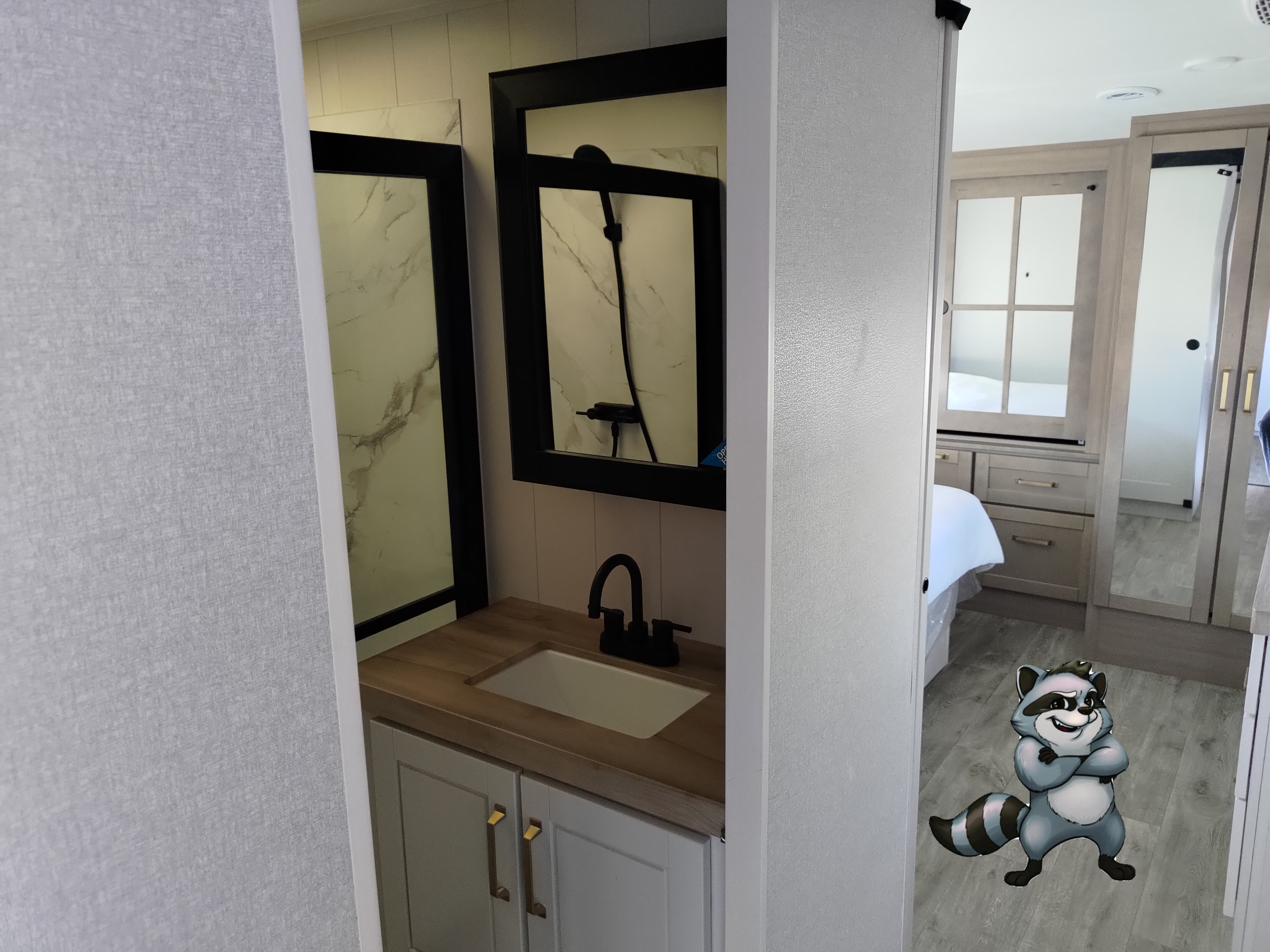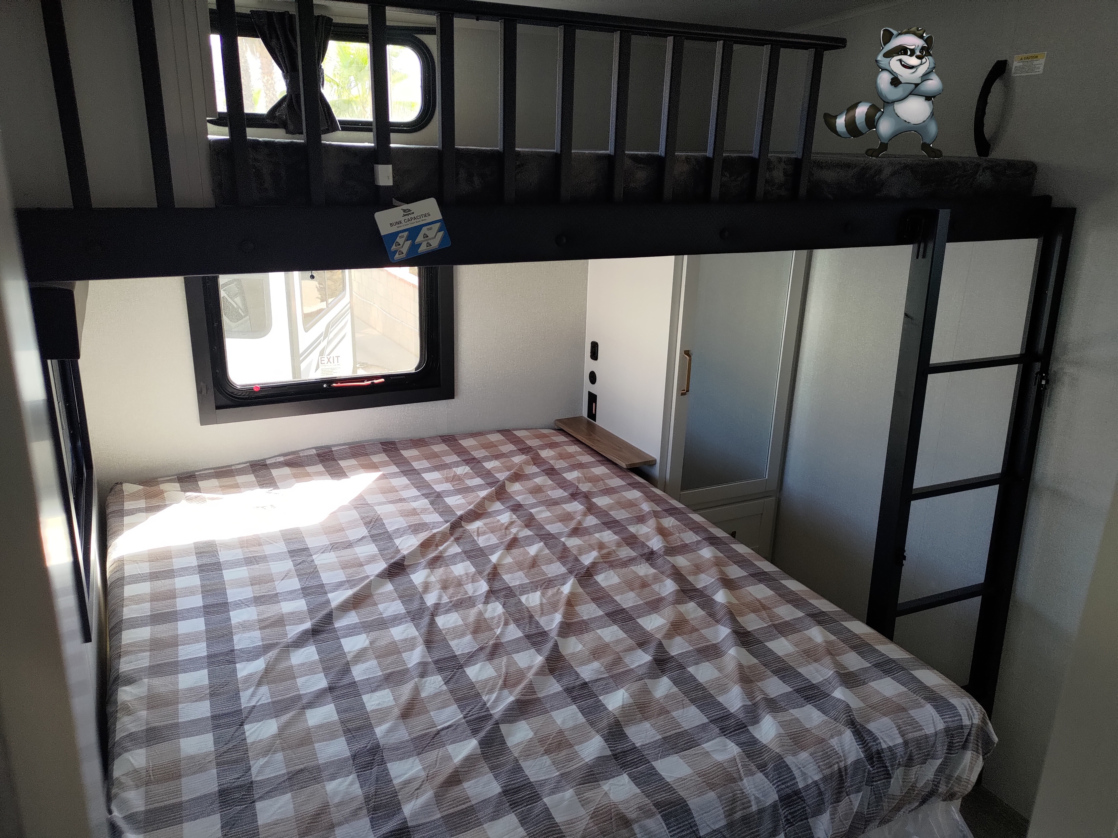 - Rear Bunk Suite with dual bunks, wardrobe, and private half bath
