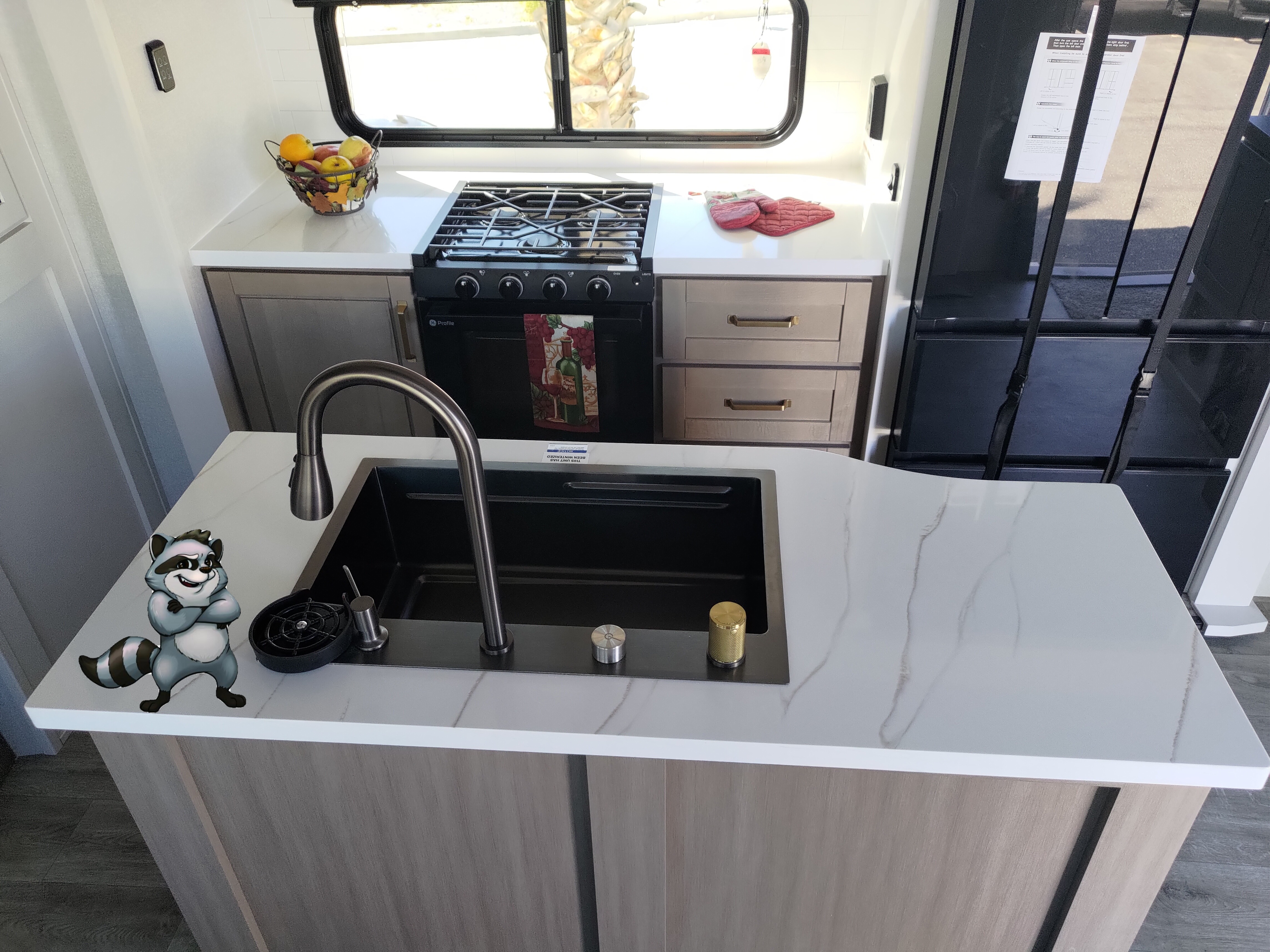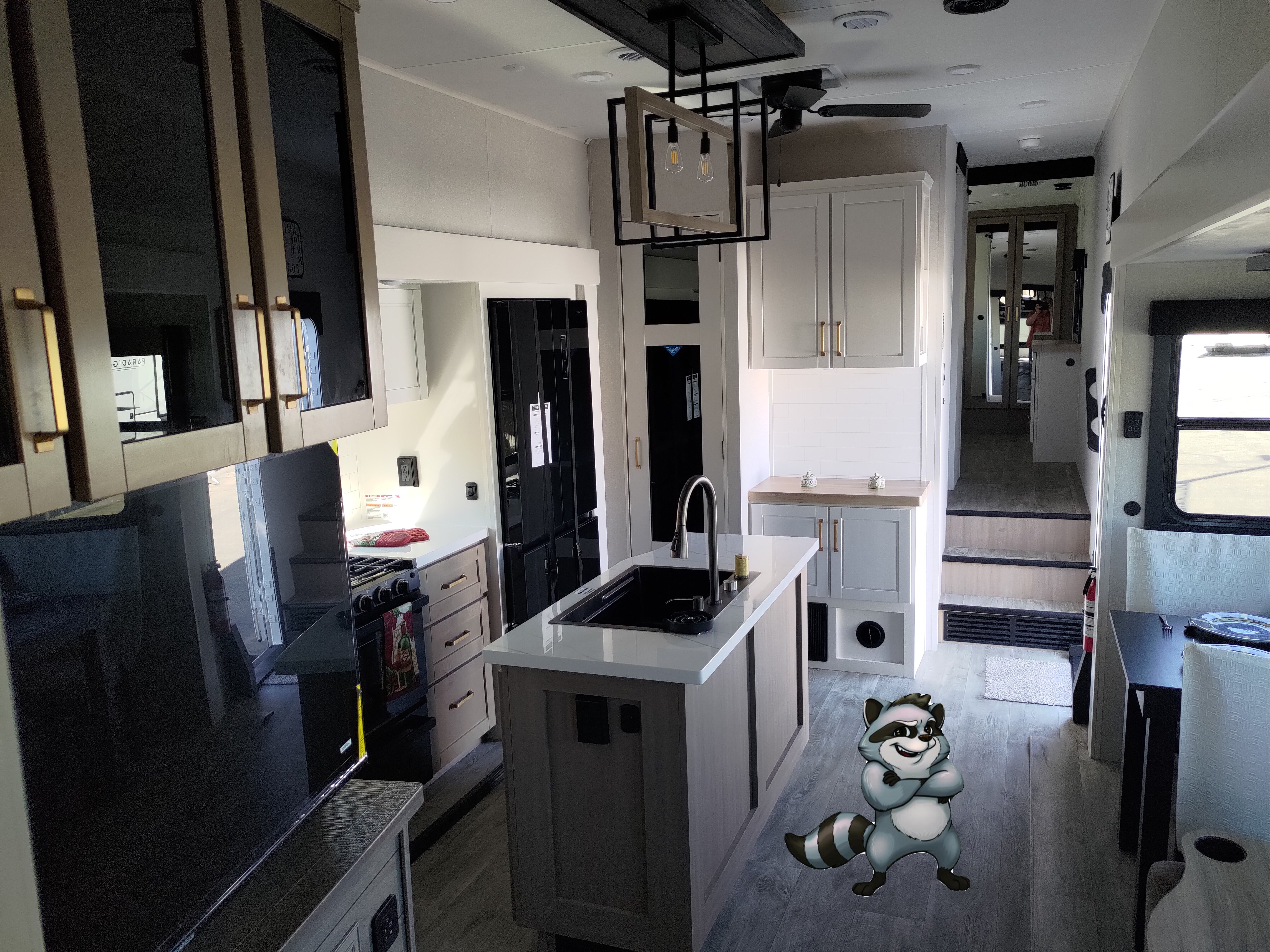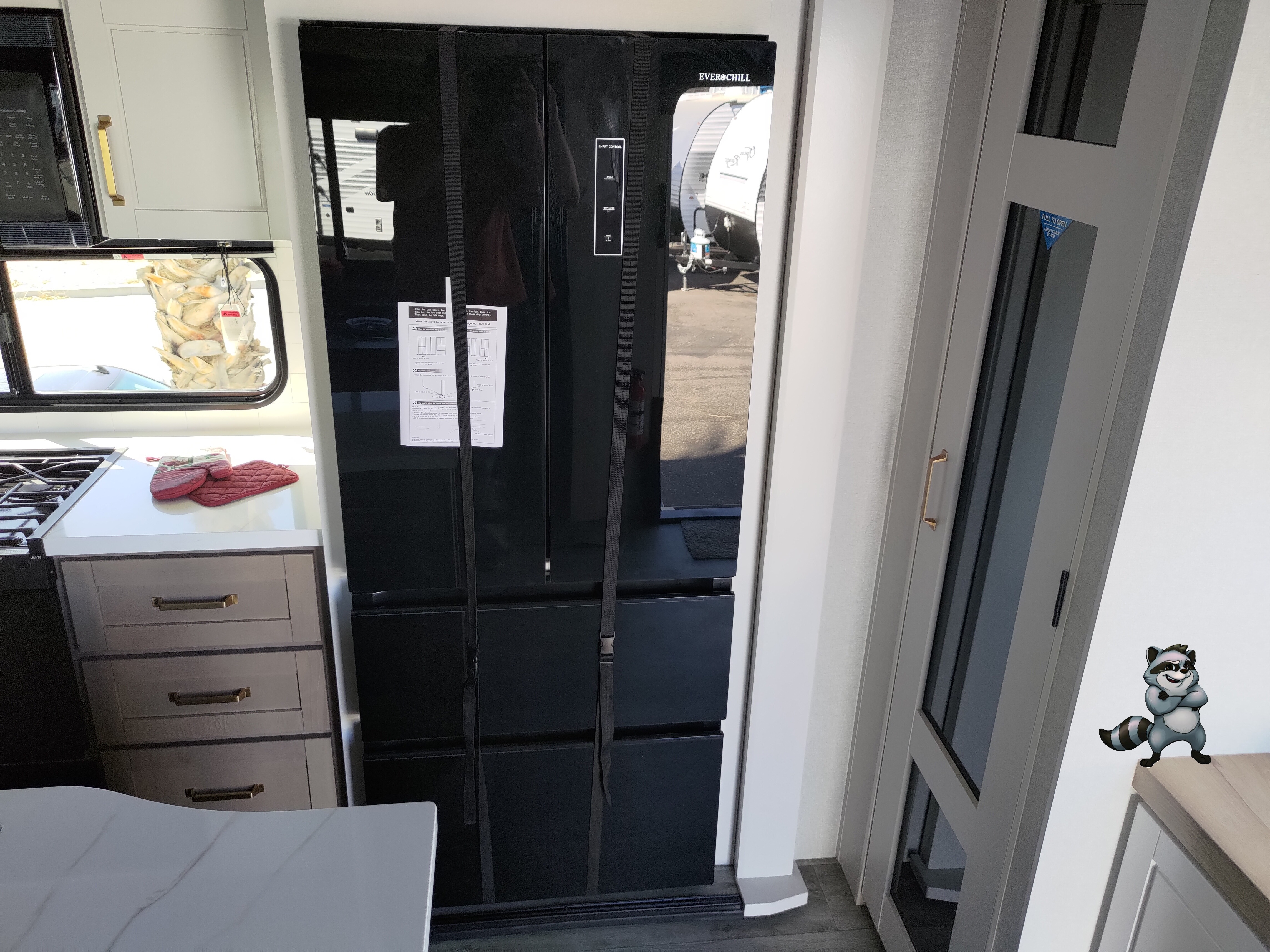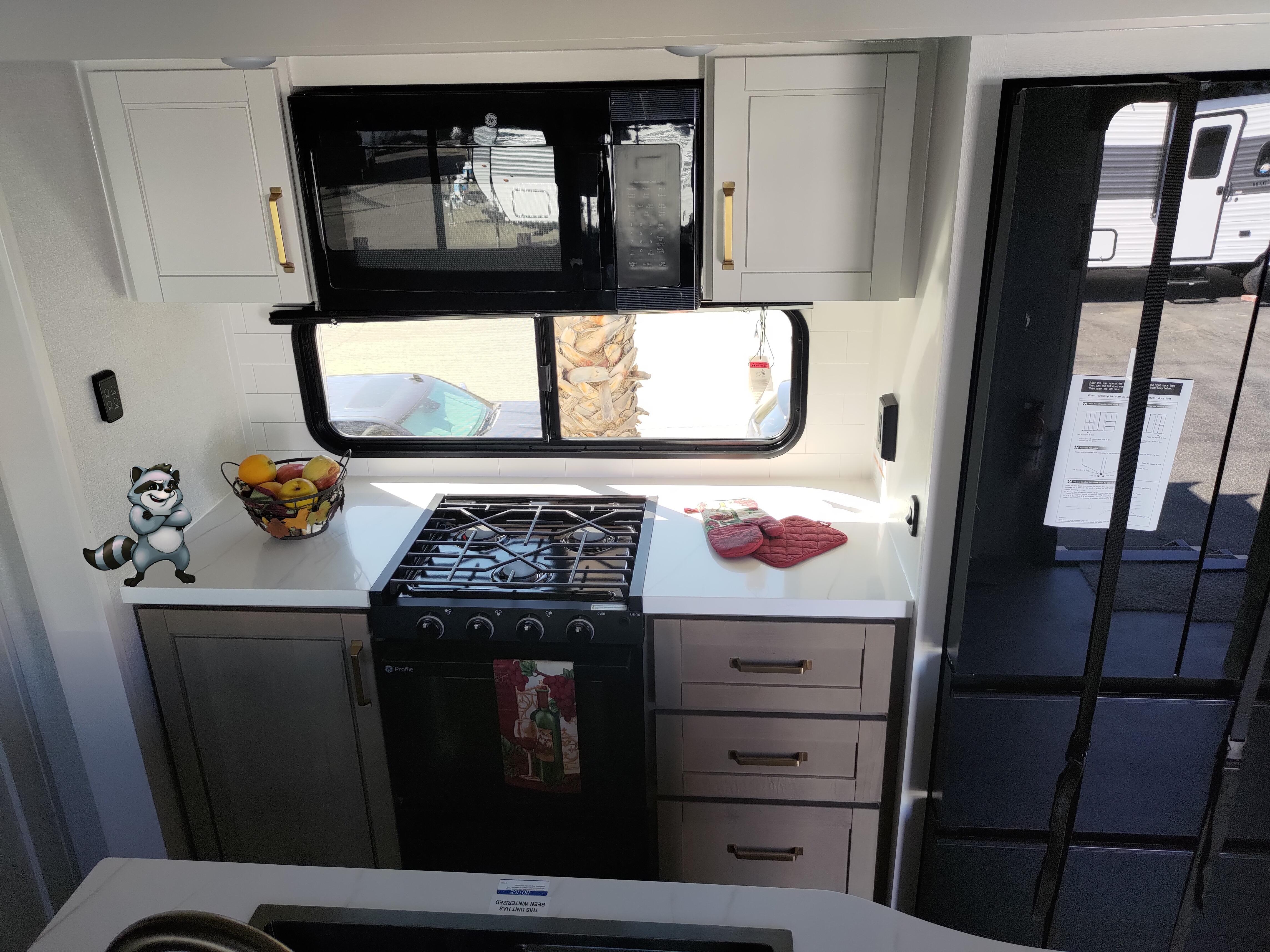 - 12V Glass-Front Fridge, 3-burner range with oven, and microwave