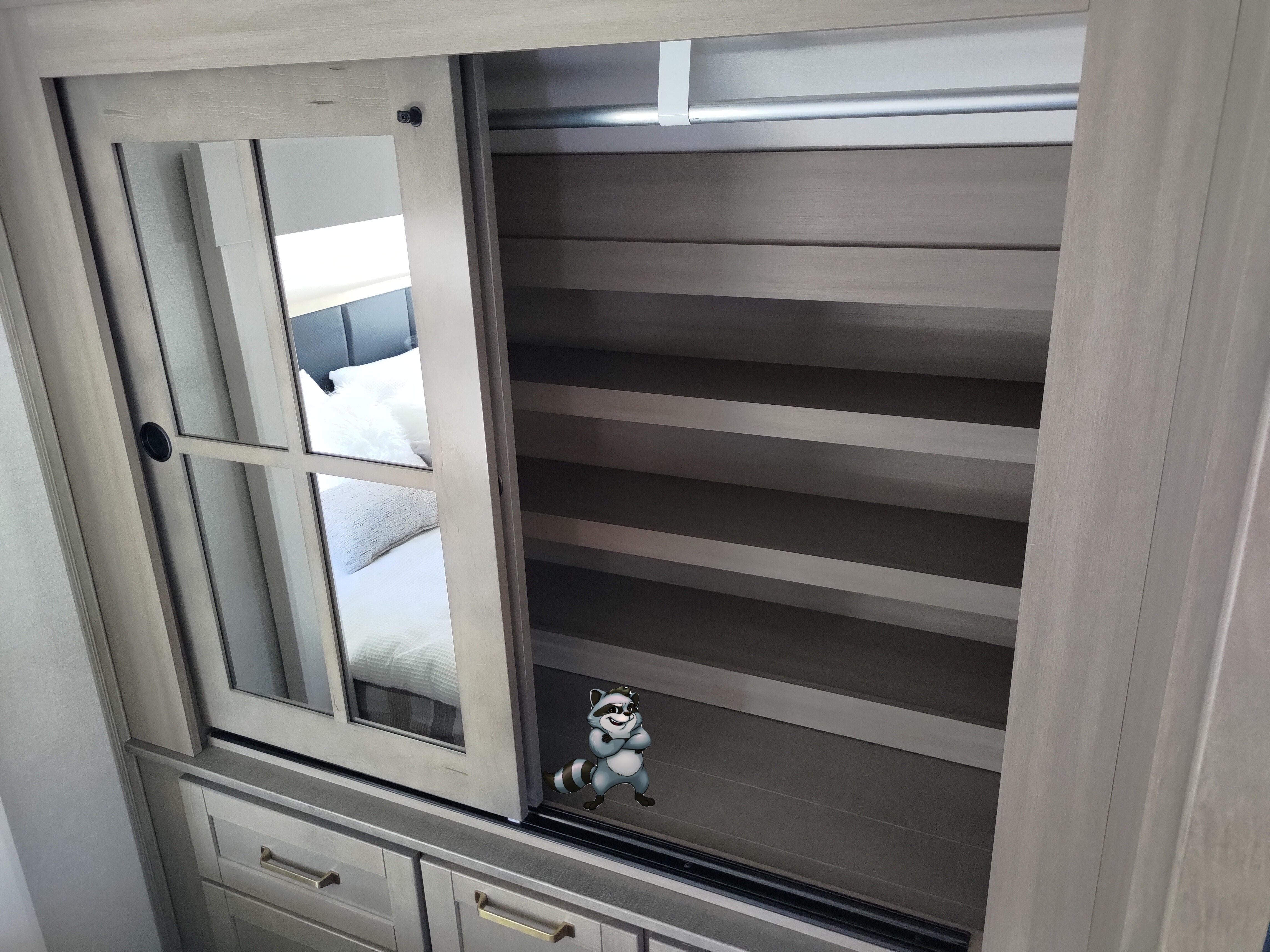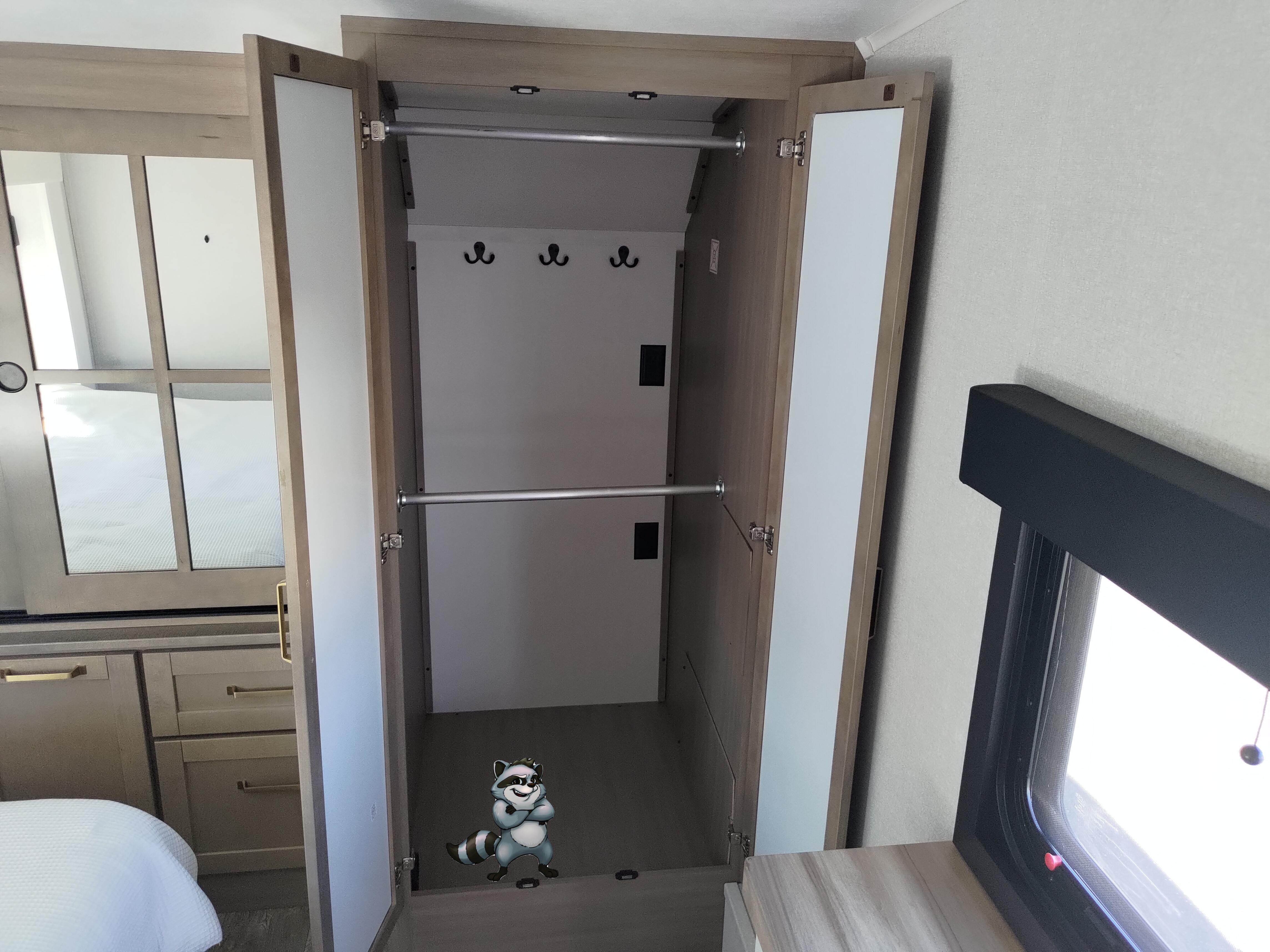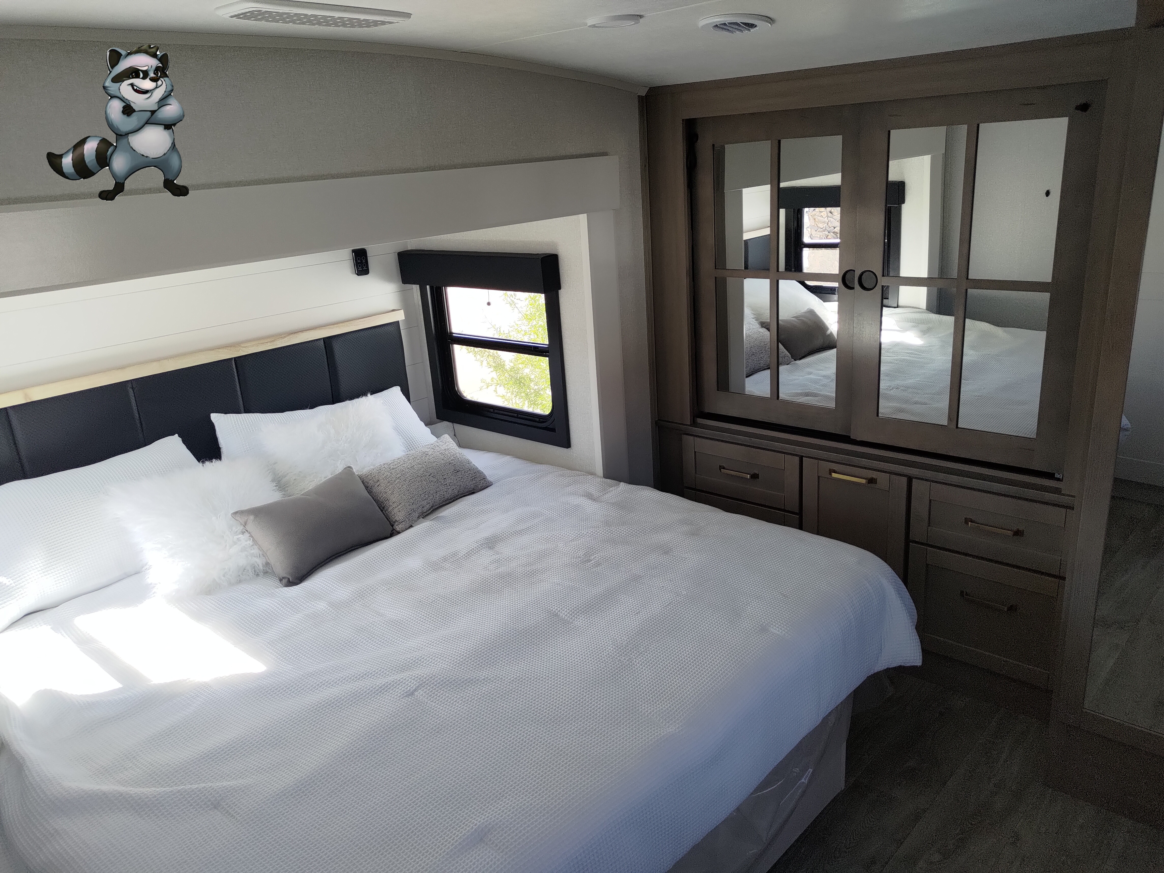 - Front King Bedroom with slide-out, wardrobe, dresser, and washer/dryer prep